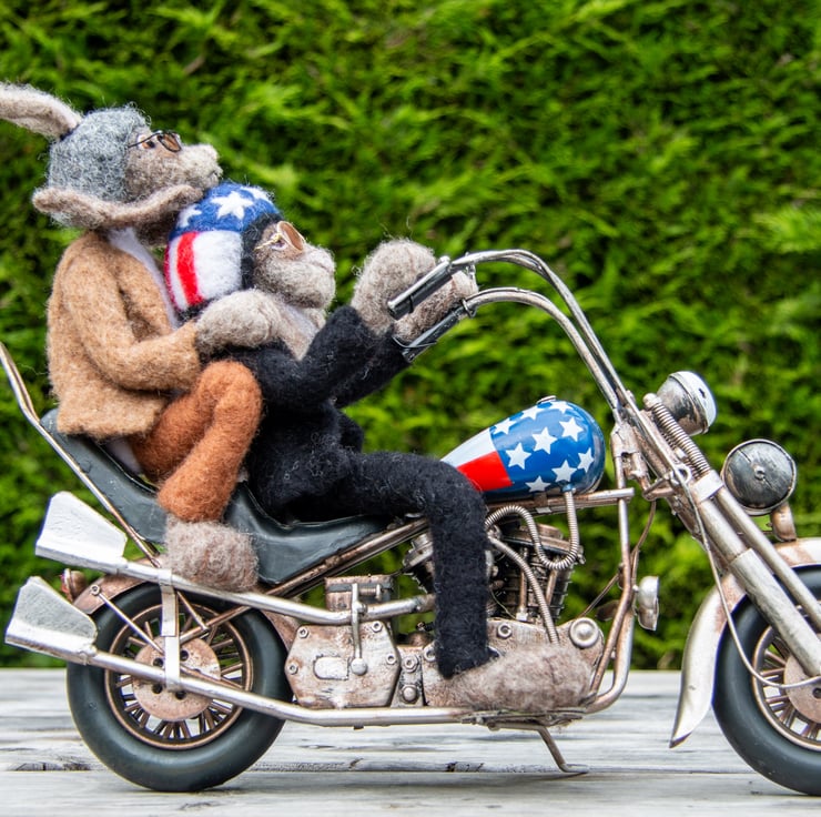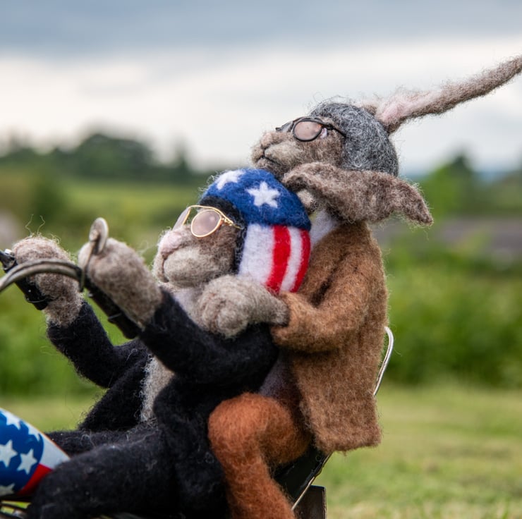 These needelfelted biker hares are sculpted from wool around wire armatures to ride this model Harley Davidson bike. Their clothing and helmets are also needlefelted and decorated with wool, their sunglasses are made from wire and resin.