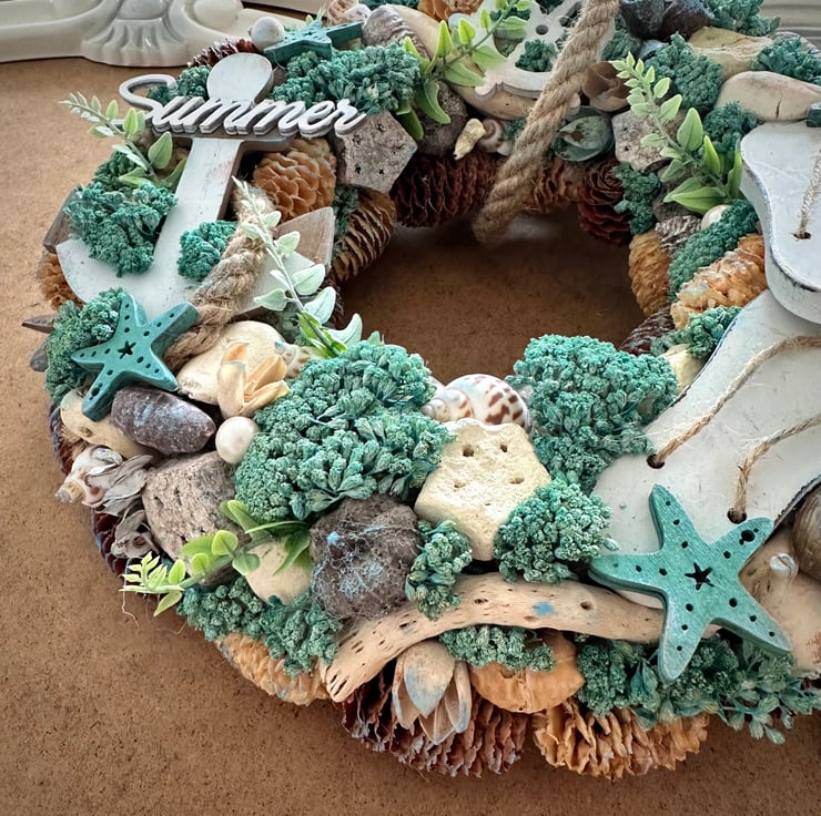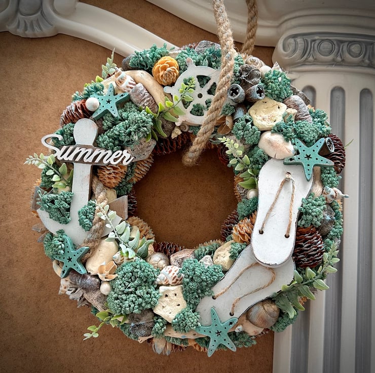 Dried blue flowers, driftwood ,seashells ,wooden embellishments make this wreath stylish for every holiday home.