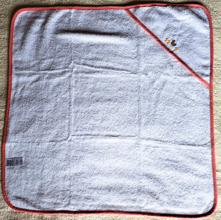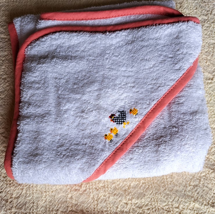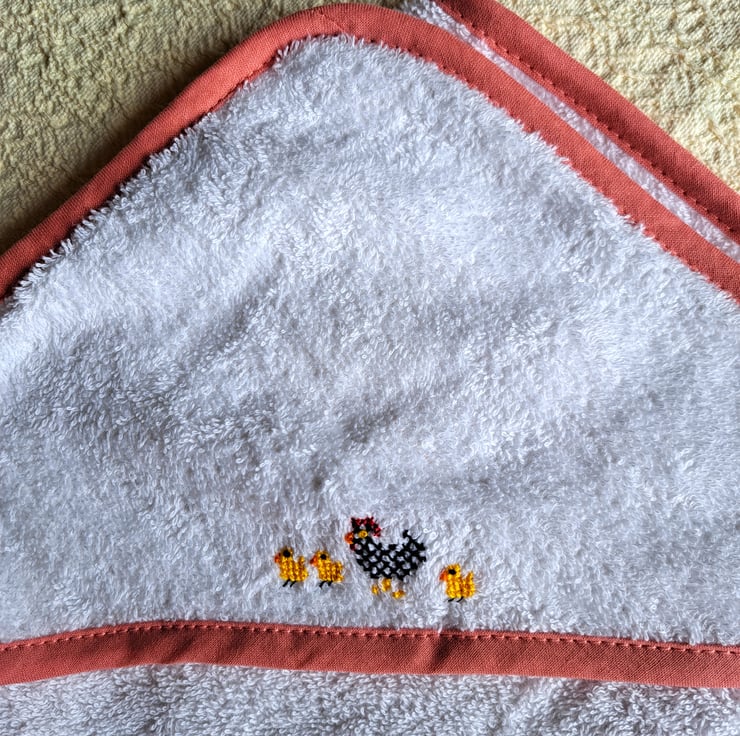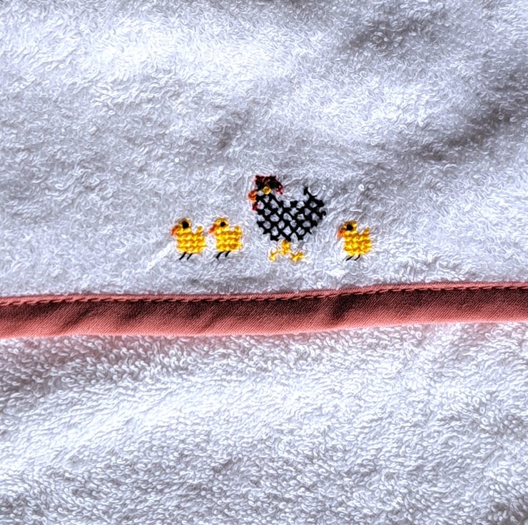 I have hand embroidered a black and white hen with three little yellow chicks on this lovely soft hooded baby towel from Tesco. The towel is white with a peach bias binding around the edges. It measures 70cm. square approximately, is all cotton and can be machine washed.