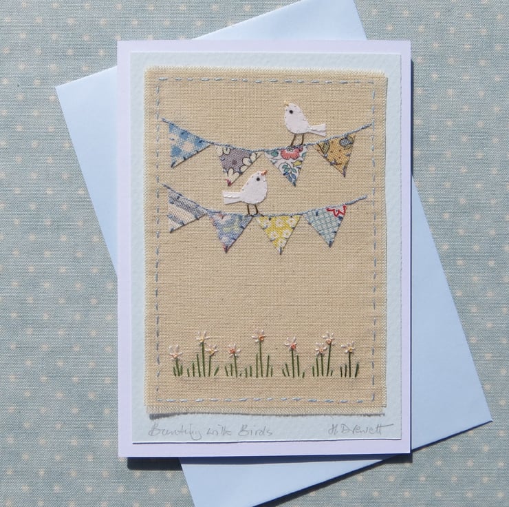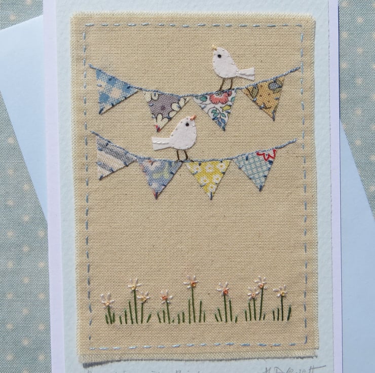This is a small greeting card featuring a unique hand-stitched miniature applique with embroidered details. The bunting flags are hand cut from pretty cotton fabrics and the birds are cut from recycled cotton. Embroidered daisies and other details intricately stitched by hand complete the design. Perfect for many different occasions - engagement, Wedding or New Baby! Birthday too of course!