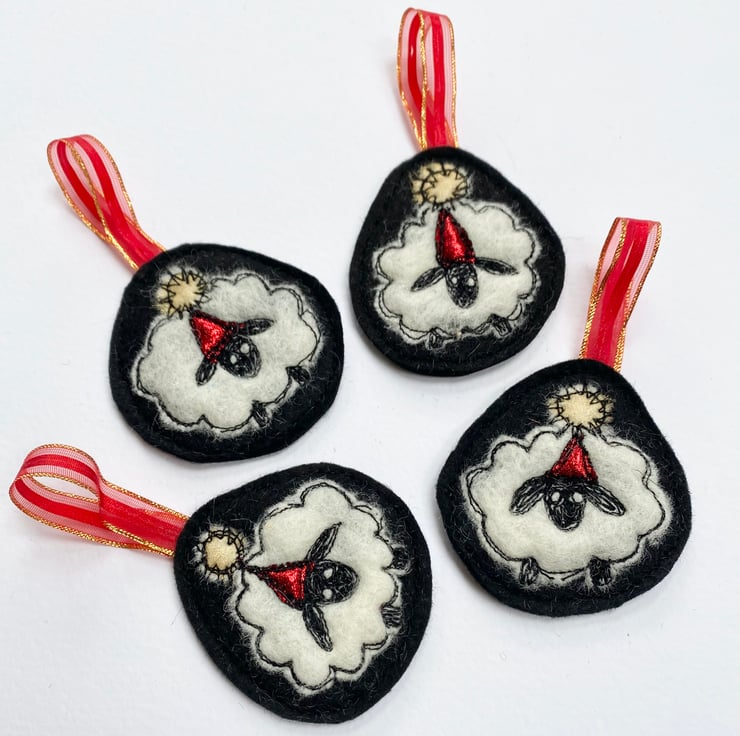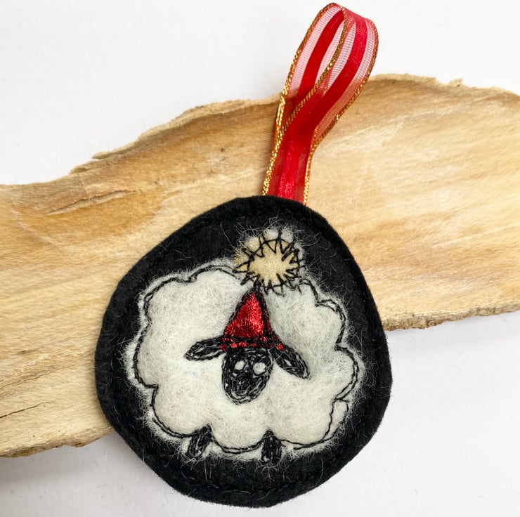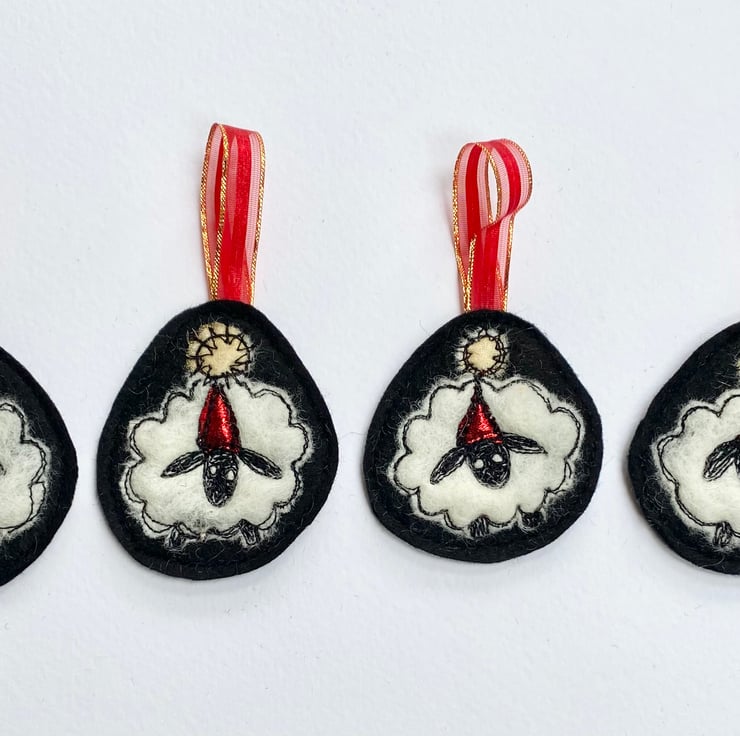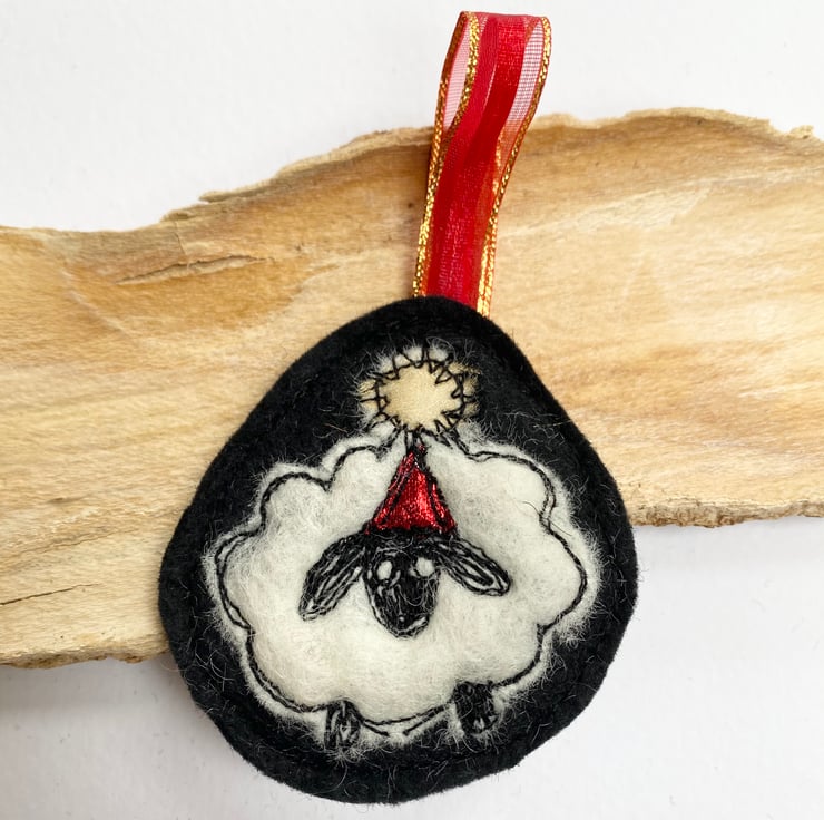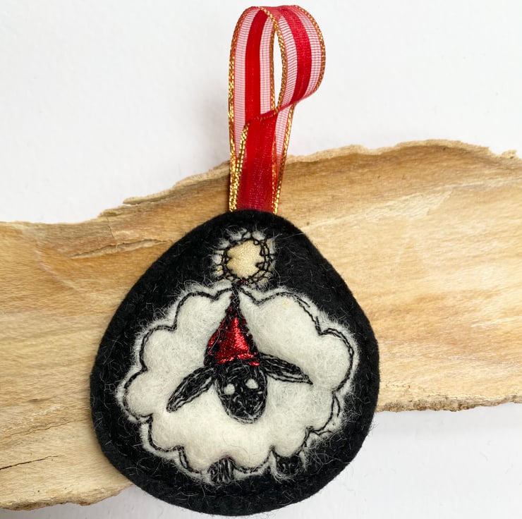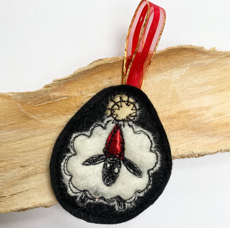 This seasonal Wendsley the sheep Christmas tree decoration has been made from up-cycled fabrics and stitched down with free motion embroidery. It comes felt backed and measures 10.5 x 6cm approx. with the matching ribbon.