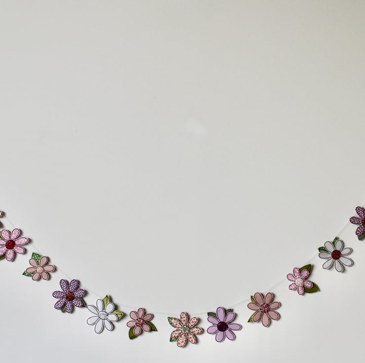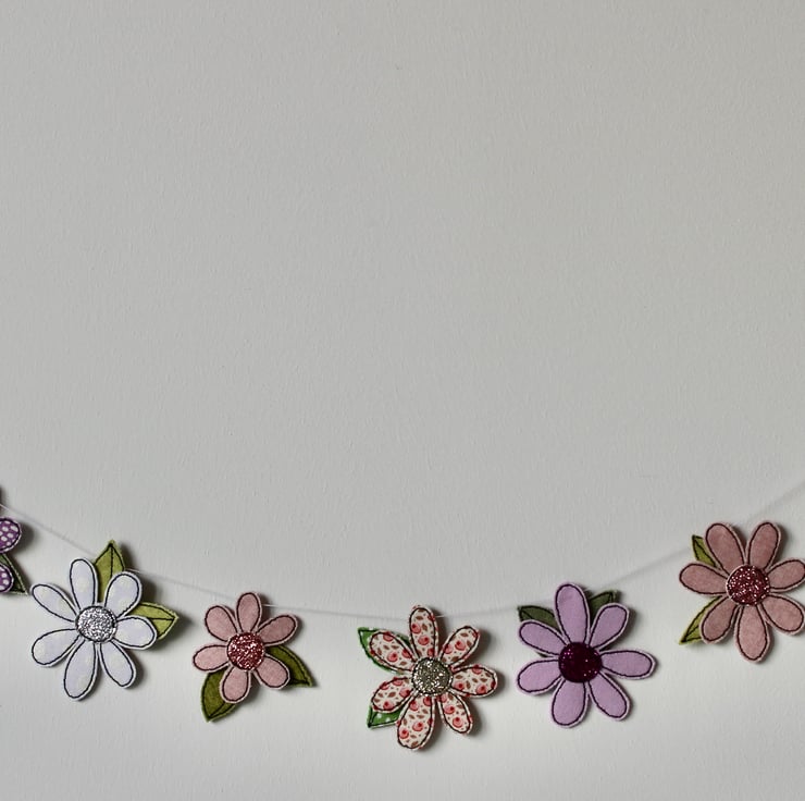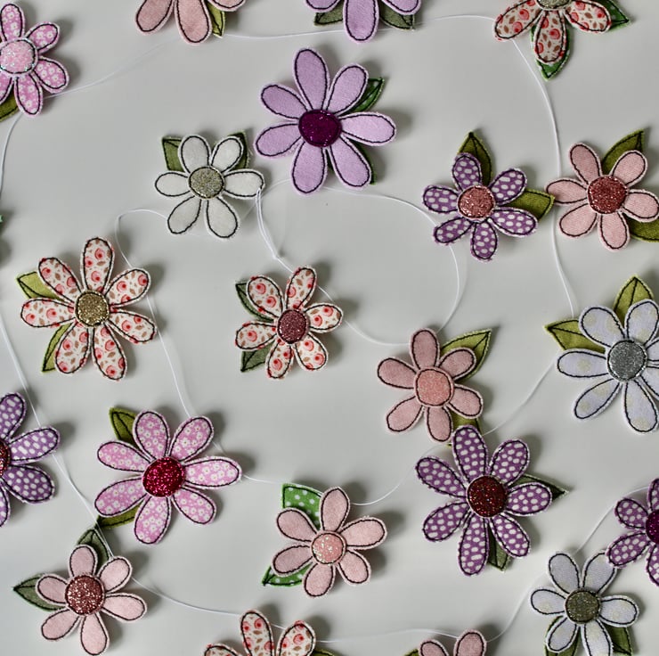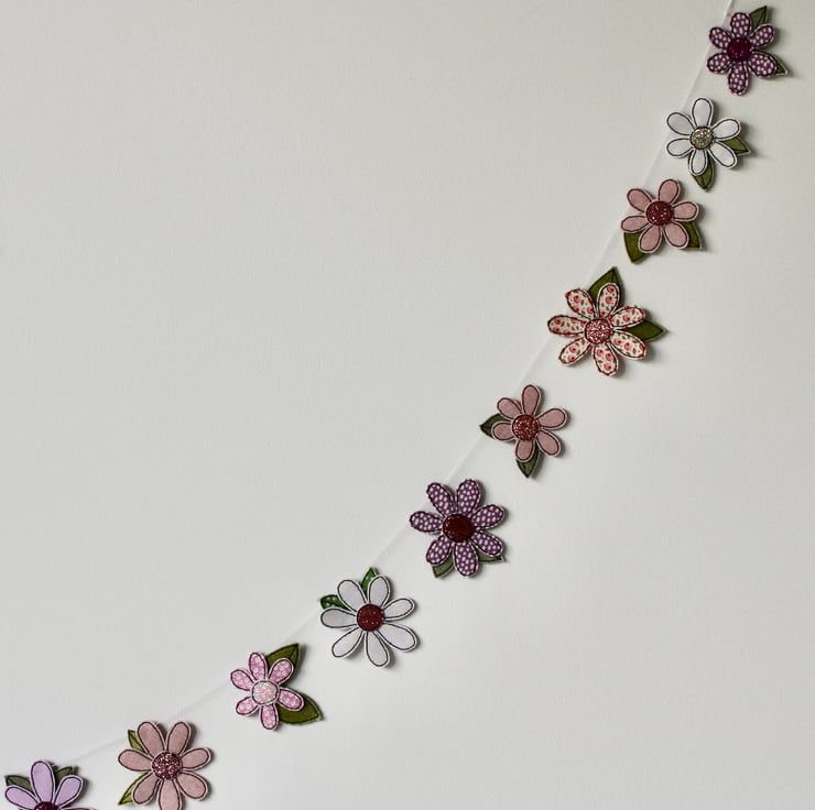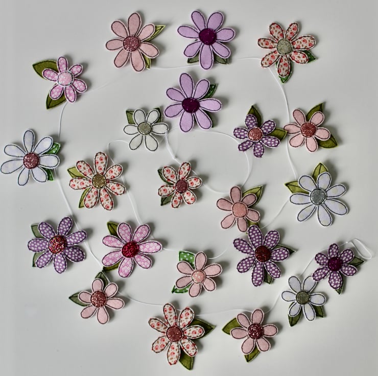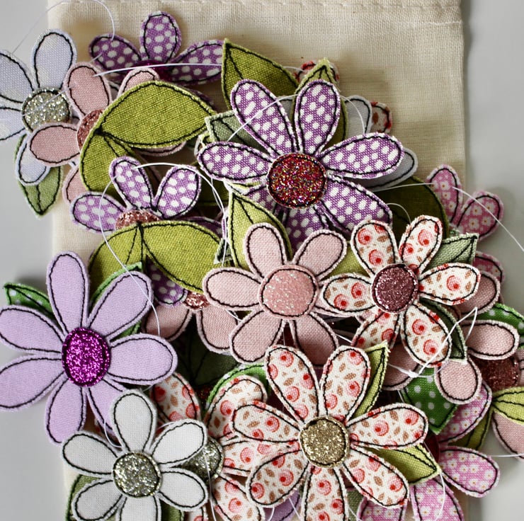 Each of the twenty-two blooms suspended along this garland, is sewn using a combination of cotton cloth, glitter cloth and free hand machine embroidery; multiple layers of cloth are sewn together and cut out by hand using very sharp scissors.