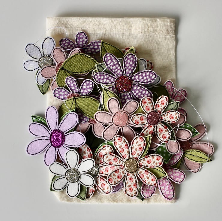Your garland will be sent in a cream fabric drawstring pouch with a little flower.