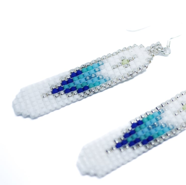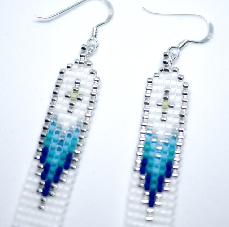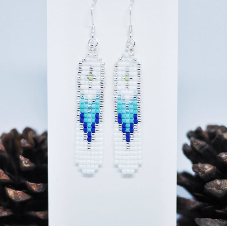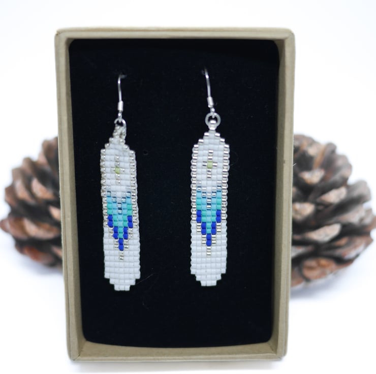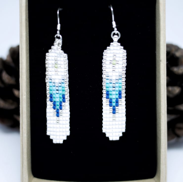 Stand out from the crowd with these bright and colourful Native American style earrings in white and shades of blue. Lightweight and comfortable to wear, these beautiful and unique earrings will brighten your jewellery box for years to come.