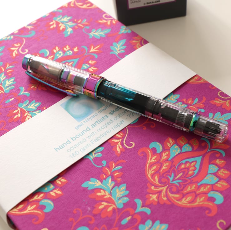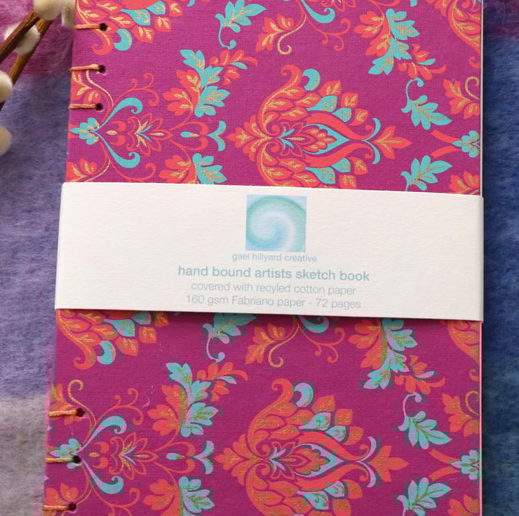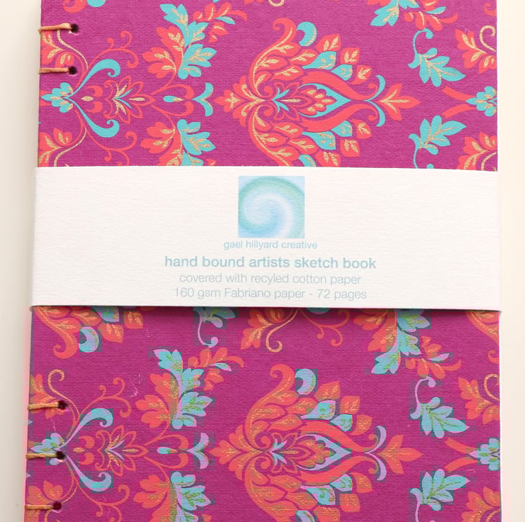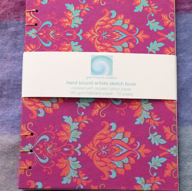 Hand made A5 sketchbook covered with beautiful cotton rich paper. Filled with 72 pages of 160 gsm Fabriano paper, perfect for ink, pencil, pen and light watercolour washes. They are sent to you beautifully wrapped in high quality tissue and posted in a carefully packaged box.