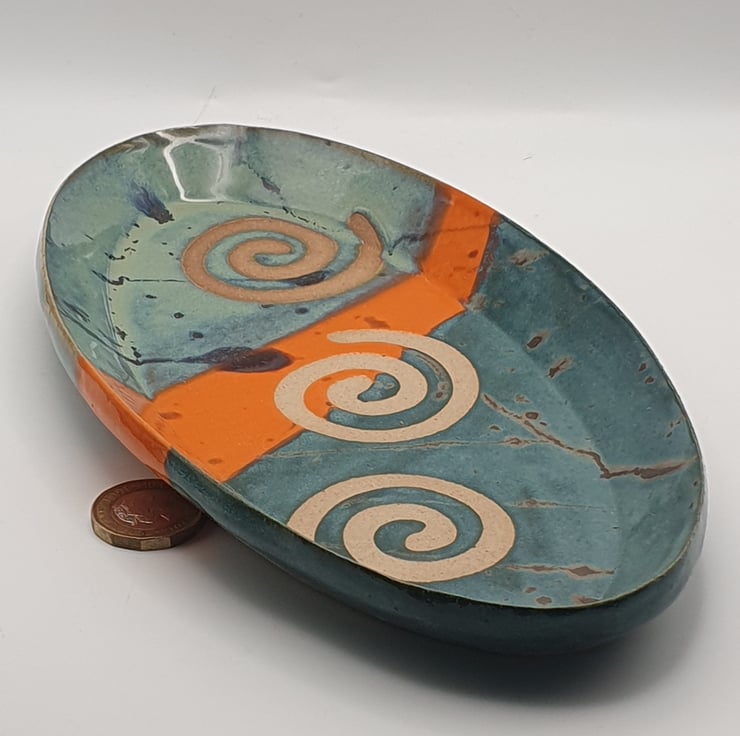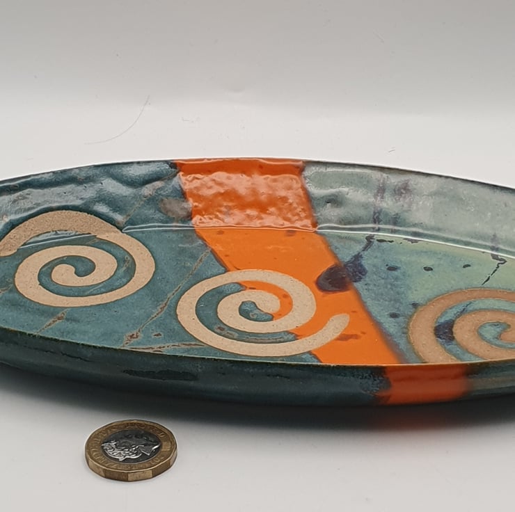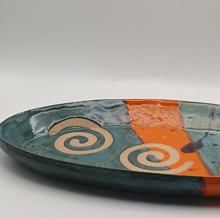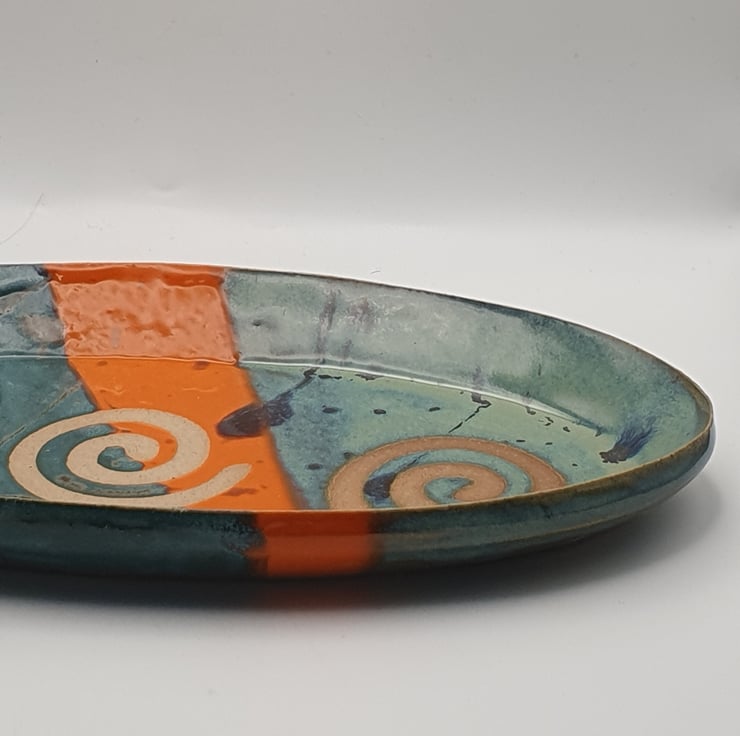 Beautiful and quirky. Oval plate. Stoneware clay.Decorated in tourmaline, turquoise and orange with speckles of brown over spiral stencils. Love it!