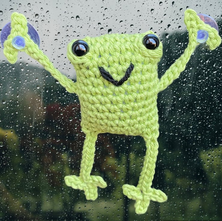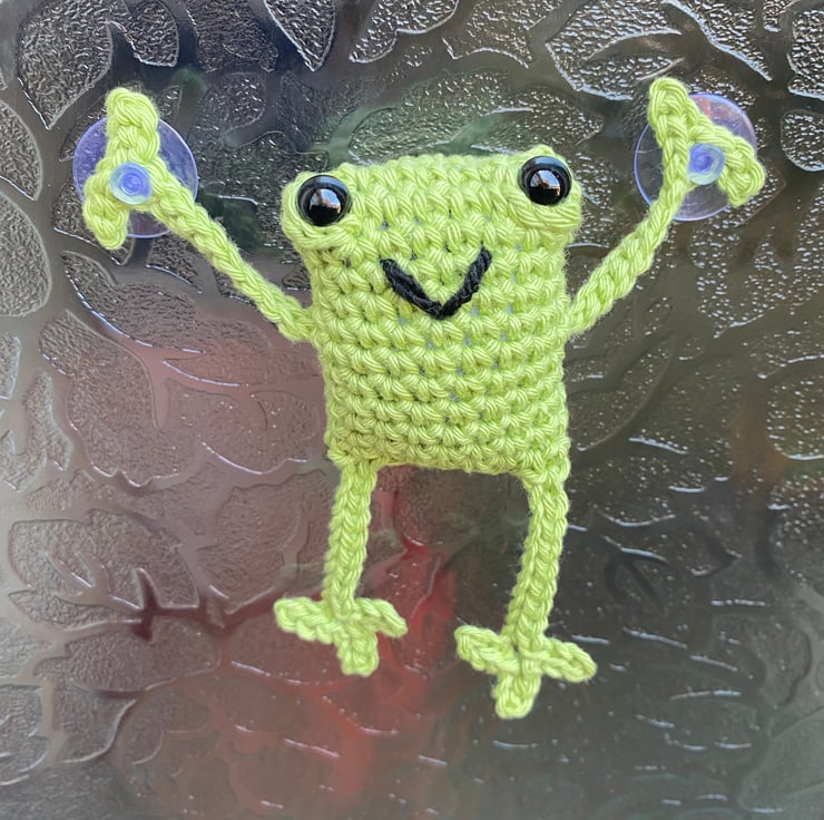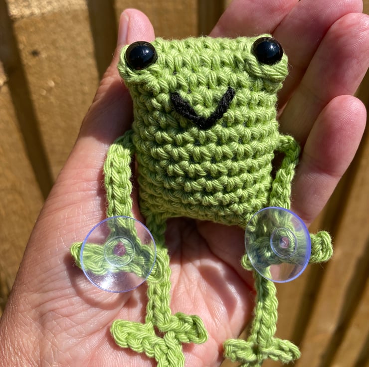 Handmade crochet leggy frog with suction cups on his hands. His infectious smile is sure to brighten your day.