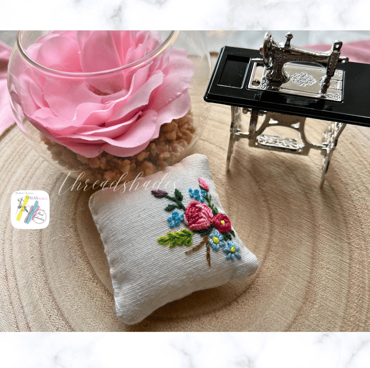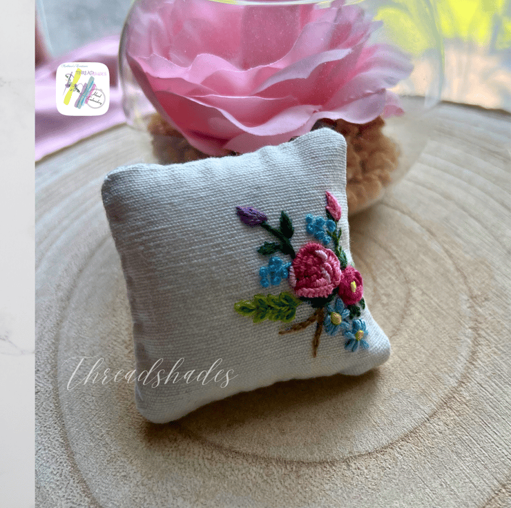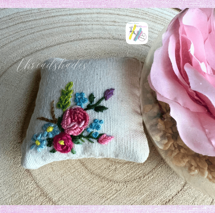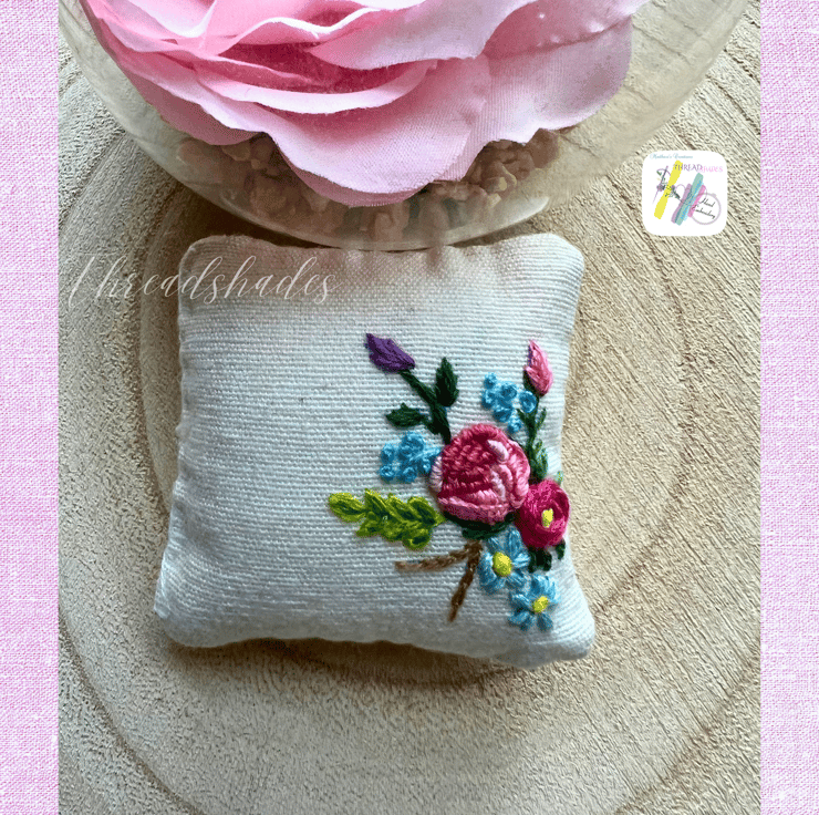 Very beautiful floral embroidery on handwoven cotton fabric enhancing the beauty of the pin cushion. Used different stitches and also the cushion is hand stitched.