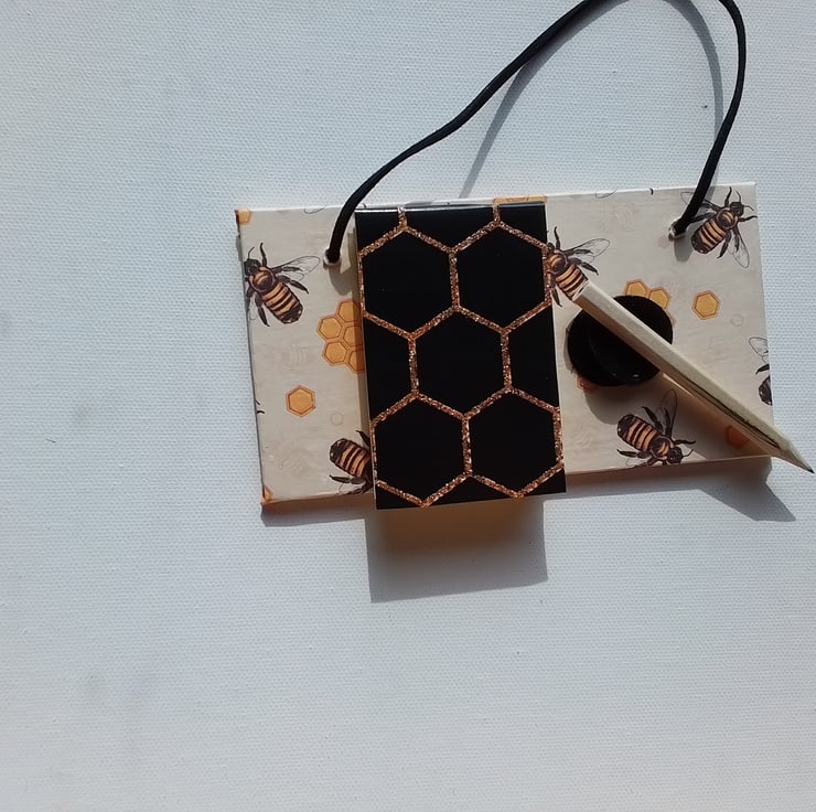 The board is covered with bee paper and the mini notepad with black and gold honeycomb paper.
