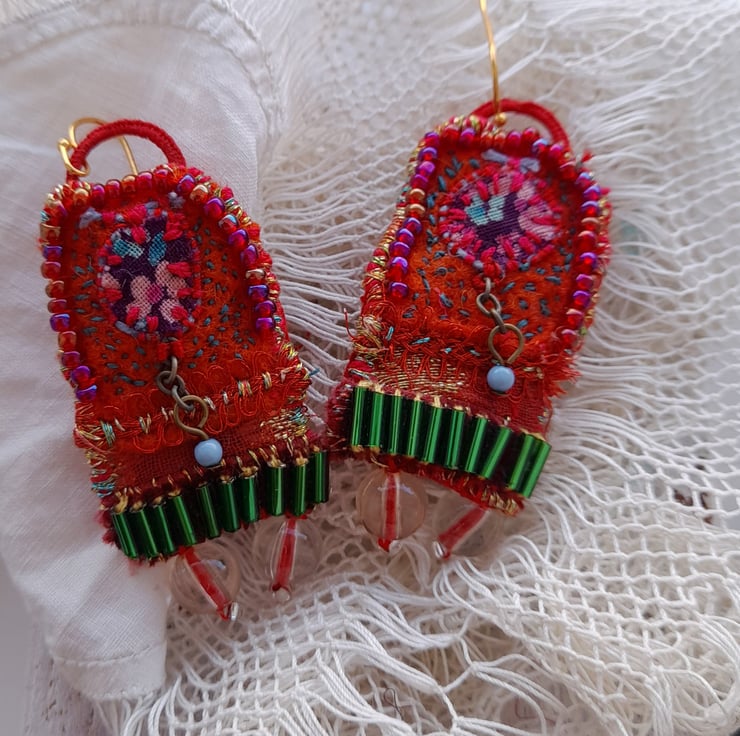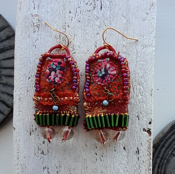 These beaded earrings measure approx 2.5 cm x 5.5 cm all hand stitched onto a felted wool base and a tiny bit of vintage textile on each. They have gold plated ear wires.