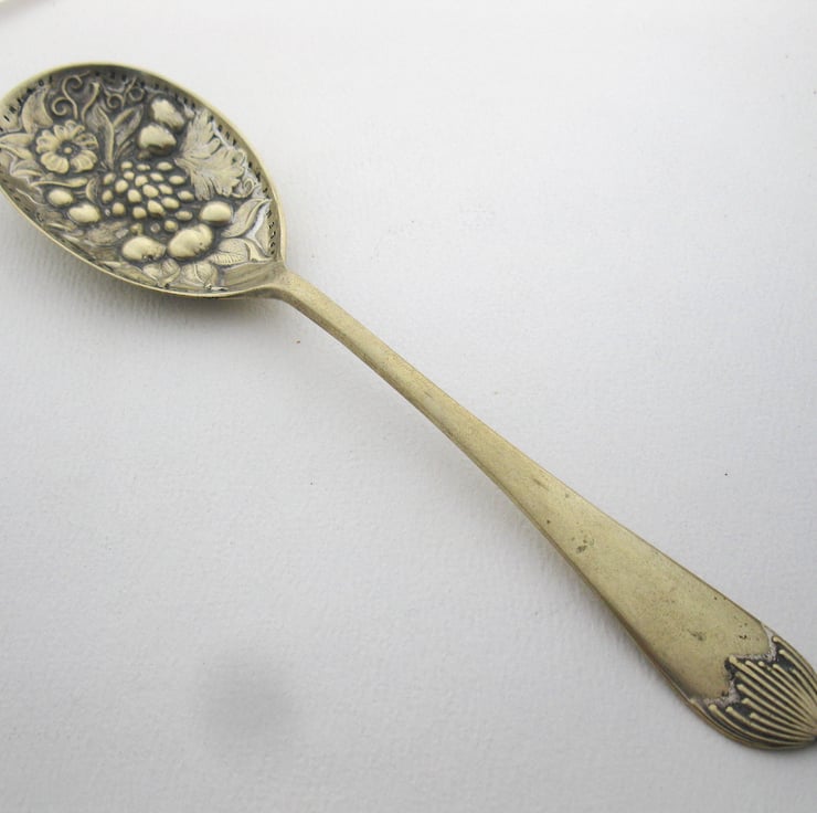 The spoon was formerly silver-plated; only traces of the original plating now remain. It measures approx. 21cm long - a nice size for serving dessert. It would make a fun little gift for a housewarming, wedding or anniversary.
