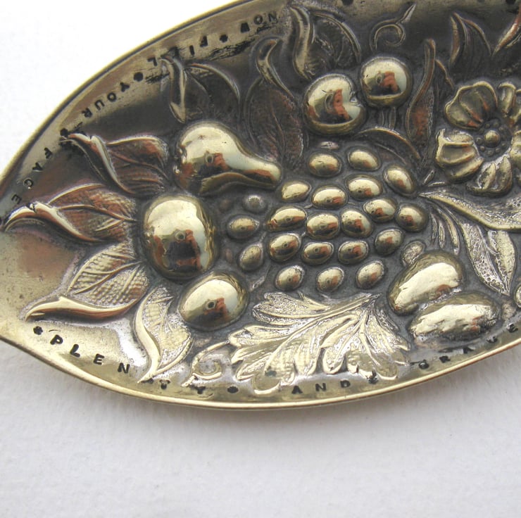 You will receive the spoon shown in the photographs. Please note that it is a vintage or indeed an antique item, I would guess Victorian, and it's been used, loved and absolutely polished to bits, so most of the original silver plating has long since been worn away to leave the brassy-coloured nickel silver alloy underneath. Also the bowl of the spoon is worn quite thin. This may not bother you but I think it's worth pointing out at this stage so that you (or whoever you give this to) won't be disappointed. This is a spoon with heaps of vintage character, rather than a mirror-finished brand-new-looking one.