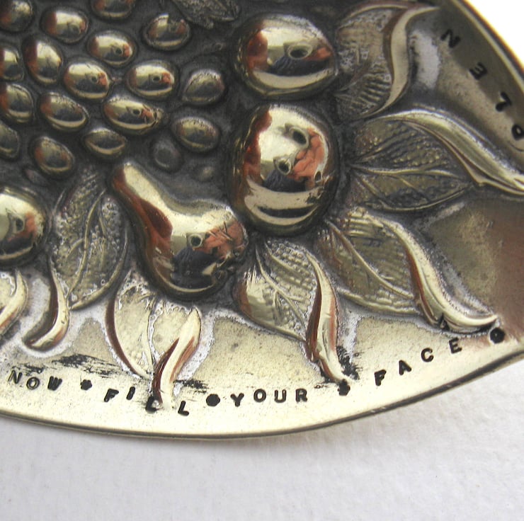 A vintage fruit pattern embossed 'berry' spoon that I've handstamped around the edge in tiny block letters:
