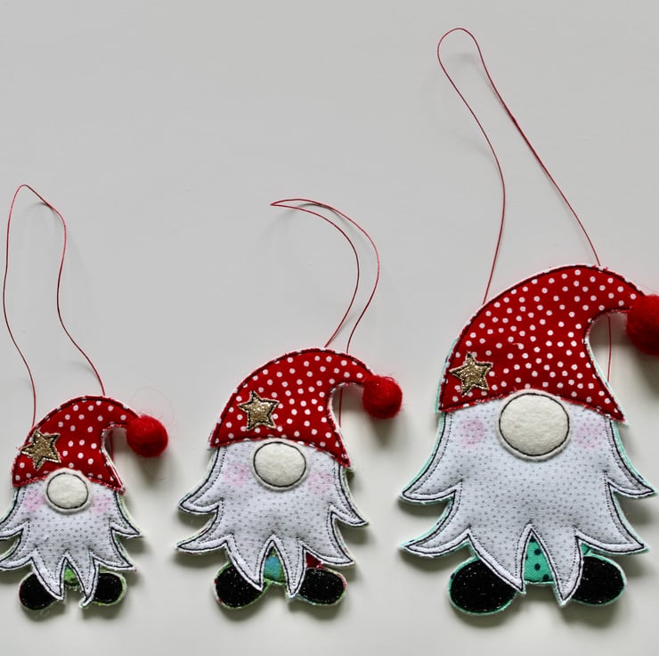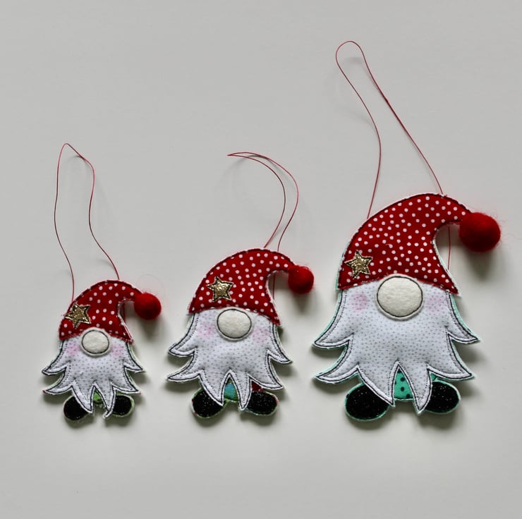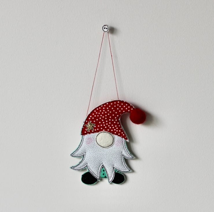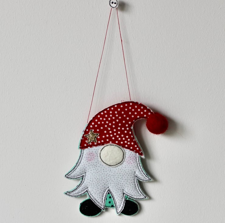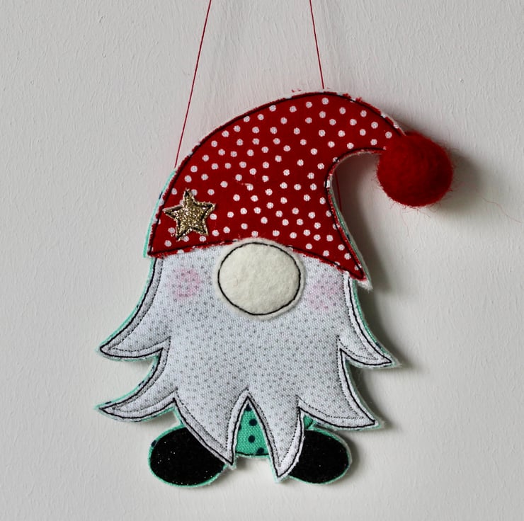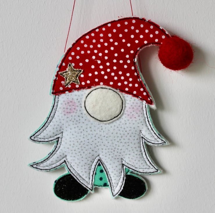 A delightful hanging decoration which is created using multiple layers of 100% wool felt, cotton cloth, glitter fabric, a handmade wool felt ball and free hand machine embroidery. It is cut out by hand using a very sharp pair of scissors.