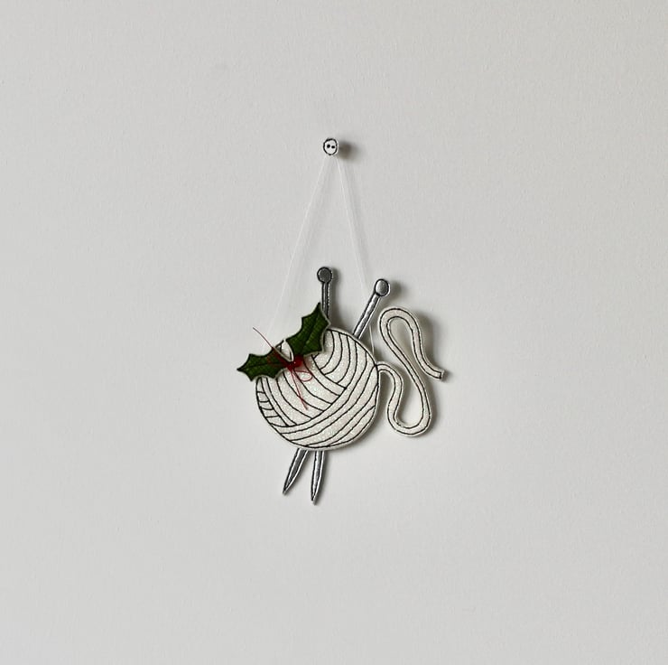 Suspend 'Wool, Knitting Needles and Holly' using the linen thread loop and add a knitting dimension to your home at Christmas or it makes a unique present for that special person who loves to knit.