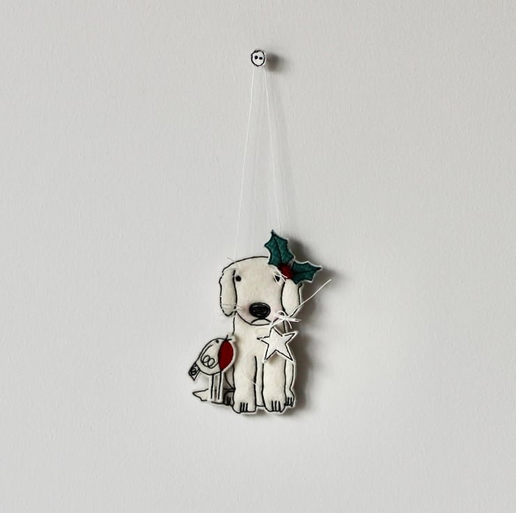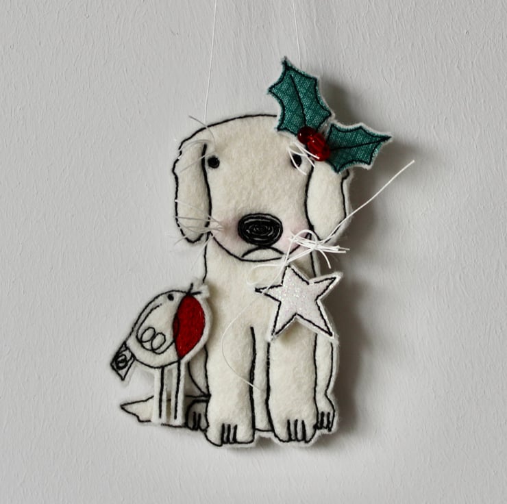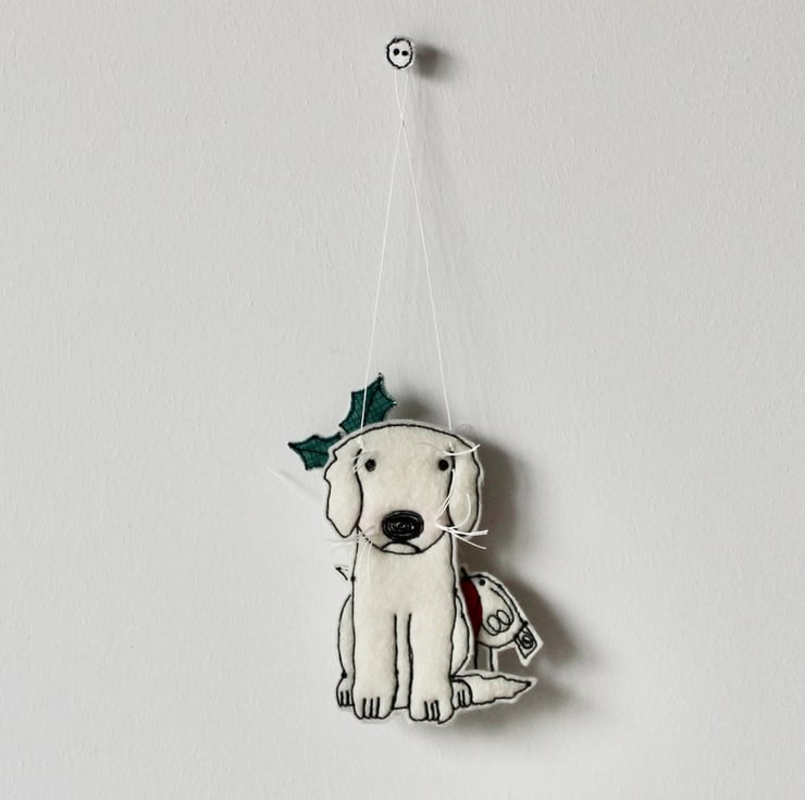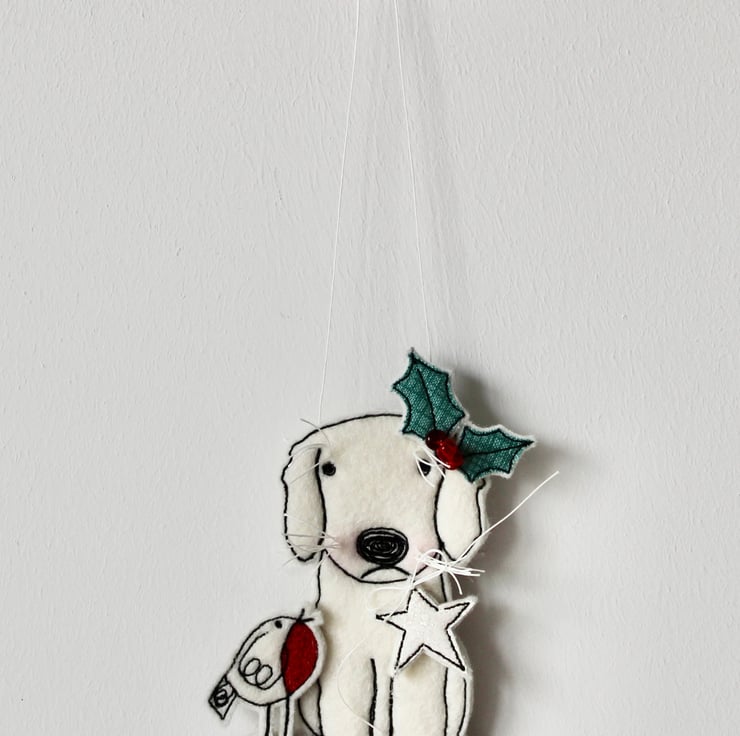 Little Puppy is created using 100% wool felt, glitter cloth, free hand machine embroidery and is cut out by hand using very sharp scissors. With linen whiskers, glass seed bead holly berries and a linen string to suspend.