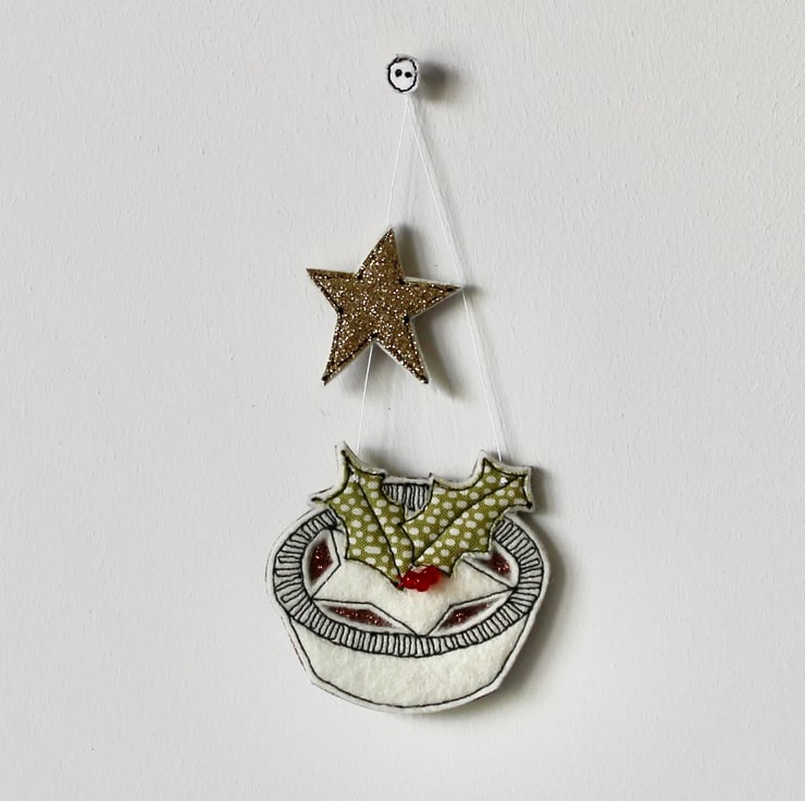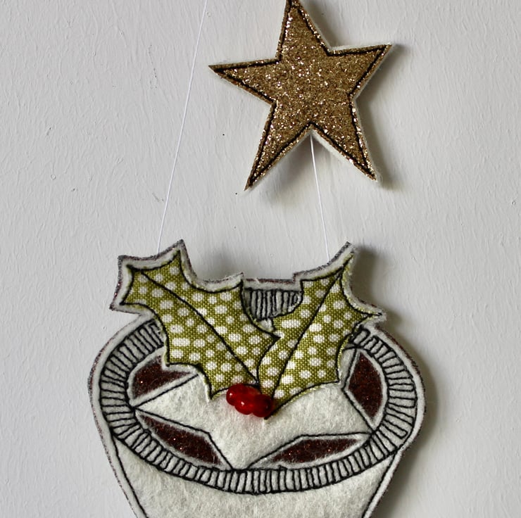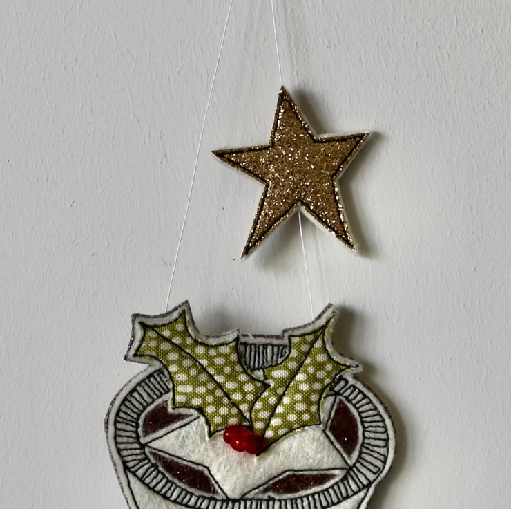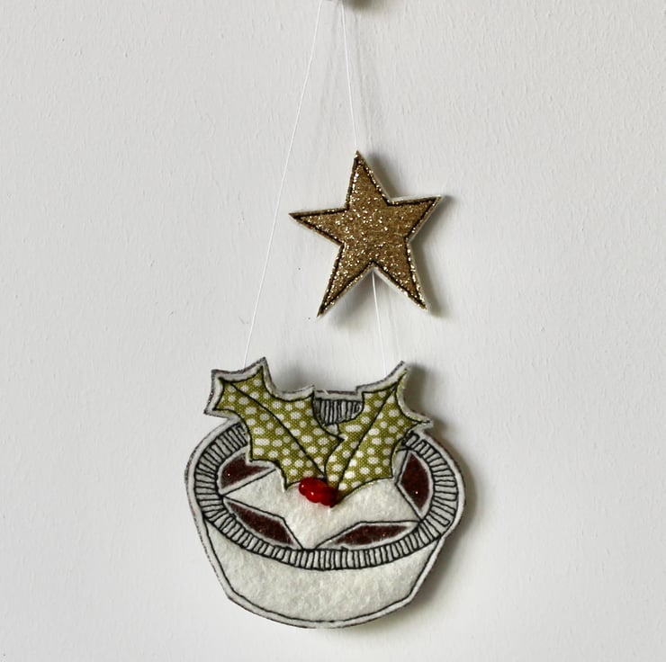 Mince pie is created using 100% wool felt, glitter cloth, cotton cloth, free hand machine embroidery and is cut out by hand using very sharp scissors. Little red glass beads make perfect berries and a sewn glittery star is attached to the linen thread for hanging.