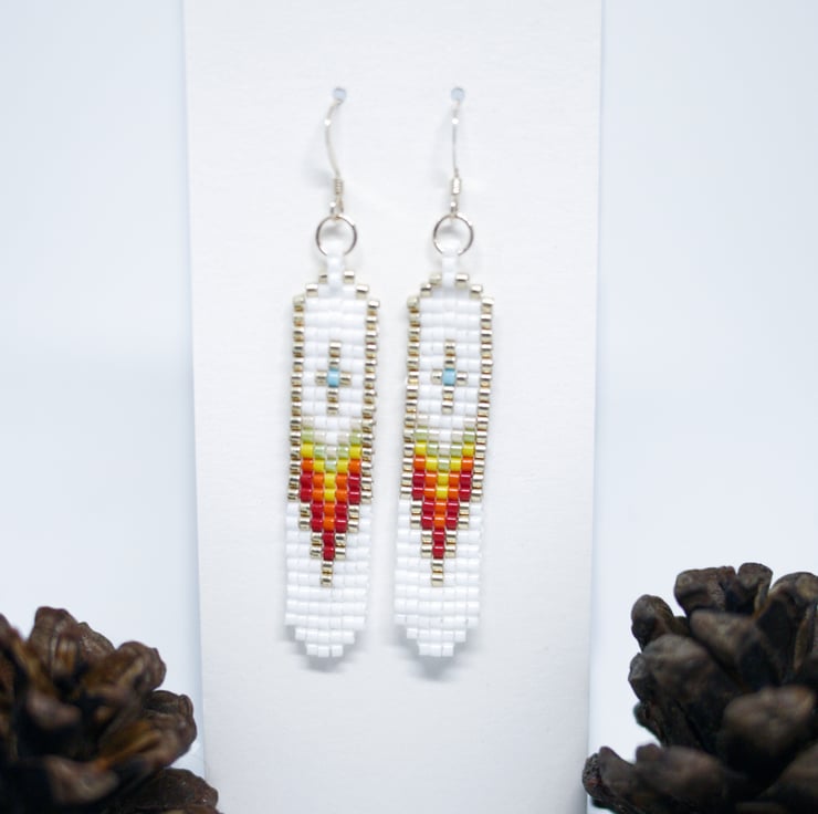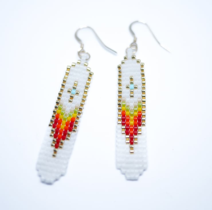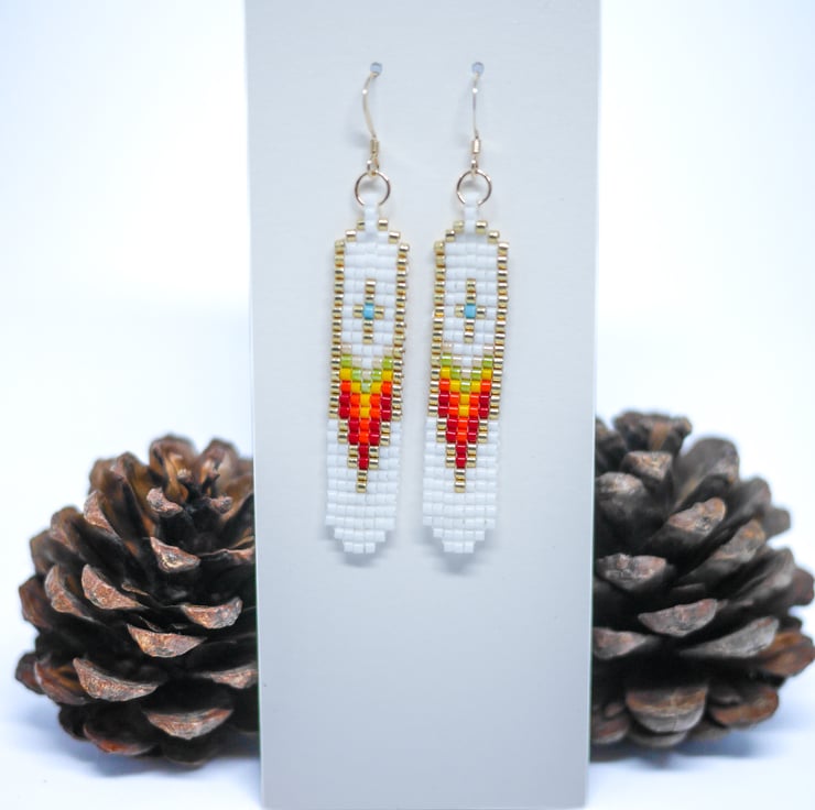 Stand out from the crowd with these bright and colourful Native American style earrings in white, gold and shades of red. Lightweight and comfortable to wear, these beautiful and unique earrings will brighten your jewellery box for years to come.