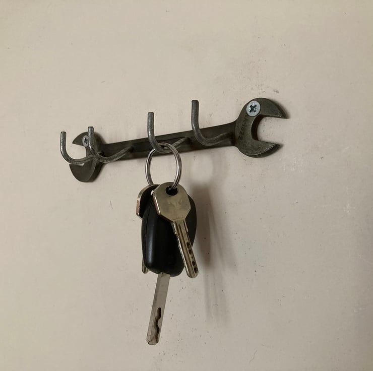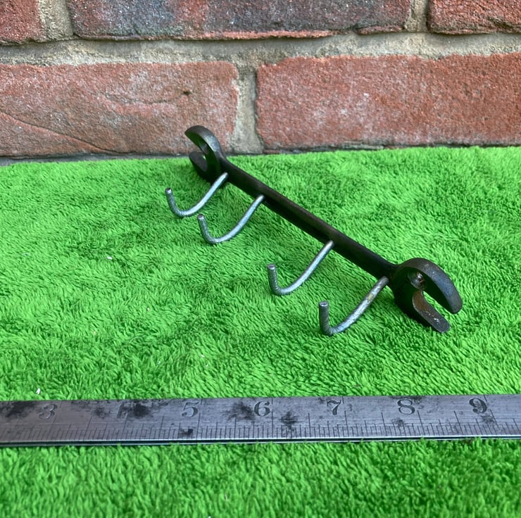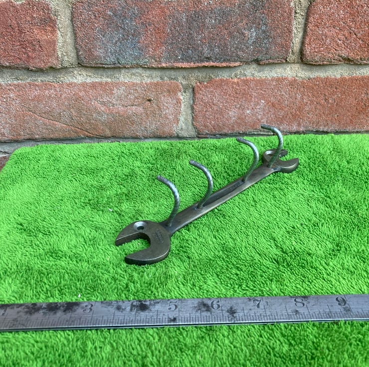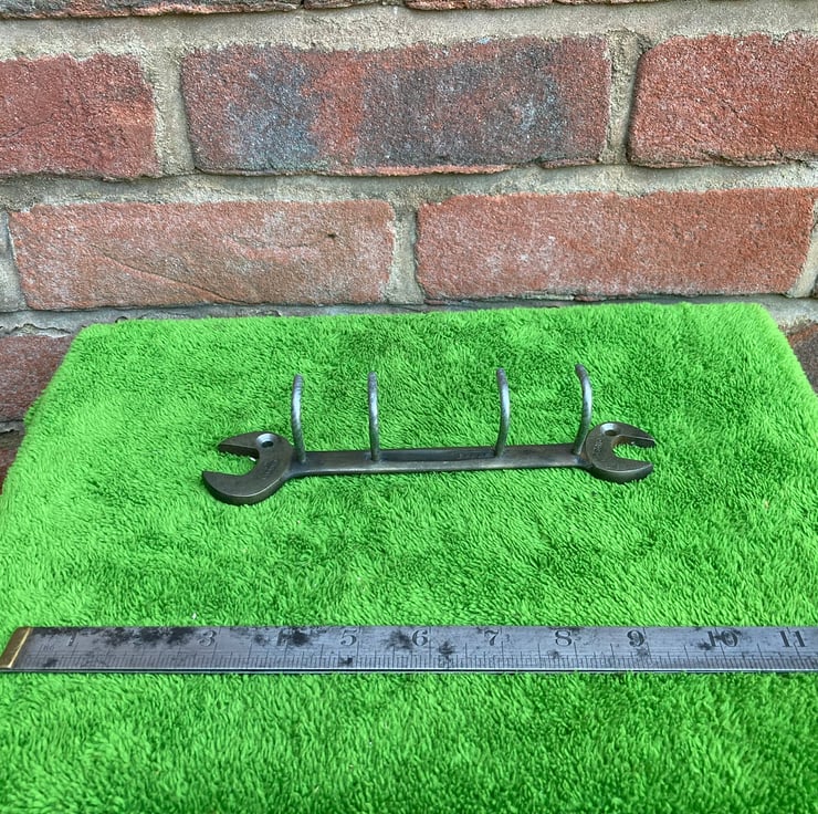 An ideal gift for the mechanic in your life, an innovative set of four key hooks mounted onto a vintage unbranded AF spanner dating back to around the 1950s. A previous owner has ground off the maker’s branding for some reason. The spanner, or wrench, has had four curved hooks mounted onto it by drilling through and welding at the rear. Two further 5mm diameter countersunk mounting holes are provided so the unit can be mounted onto a door or wall. I have treated the assembly with beeswax to preserve it and seal in the patina.