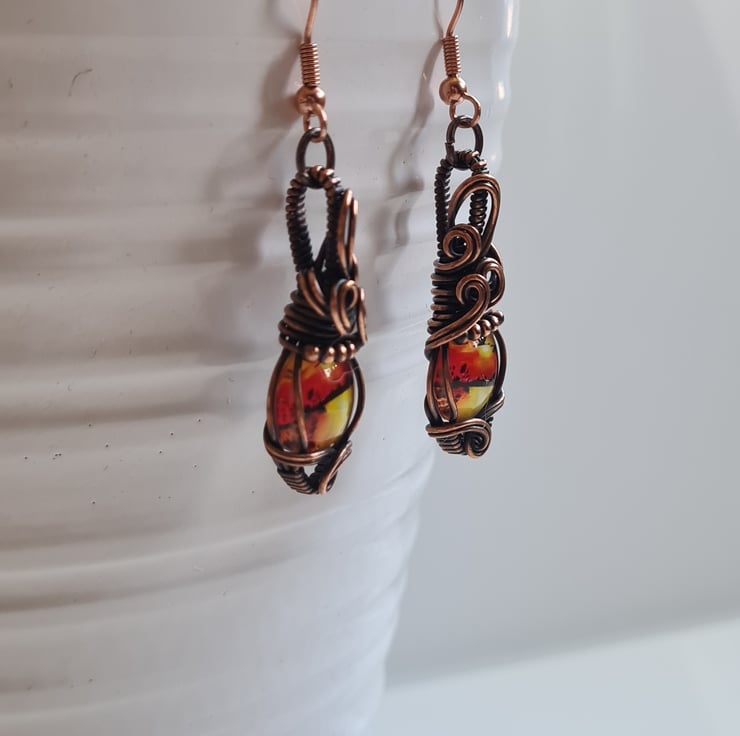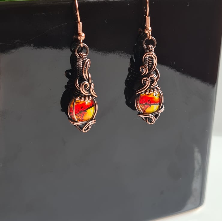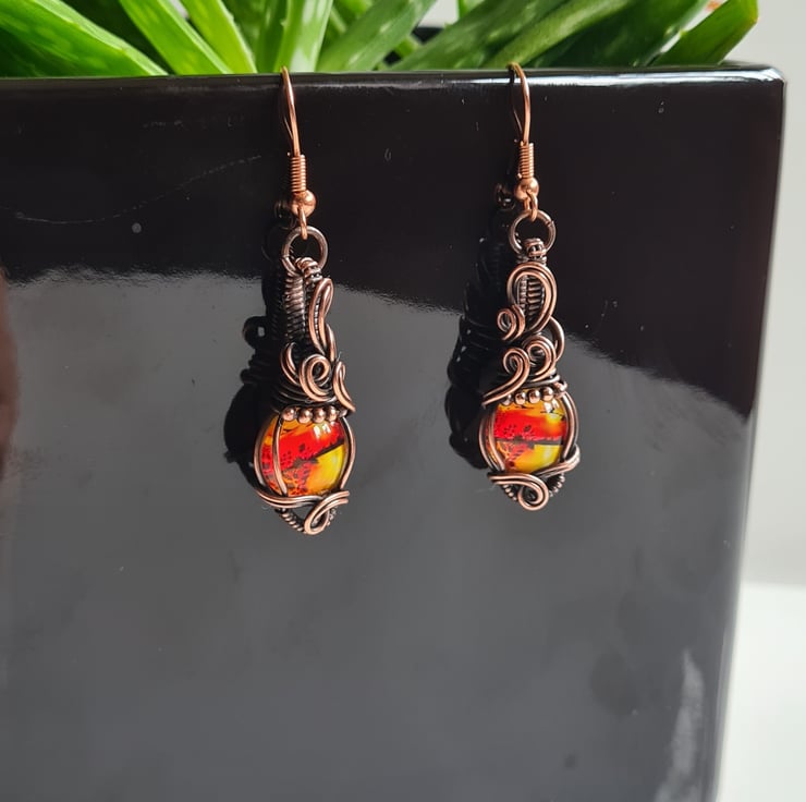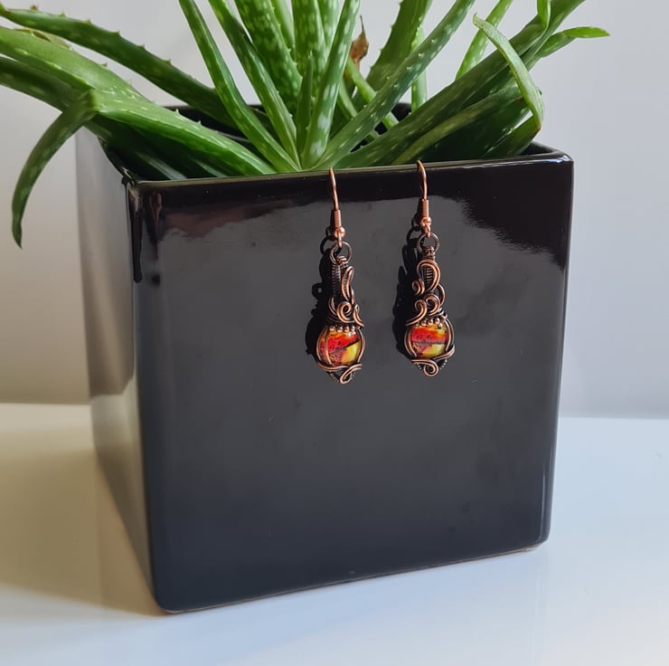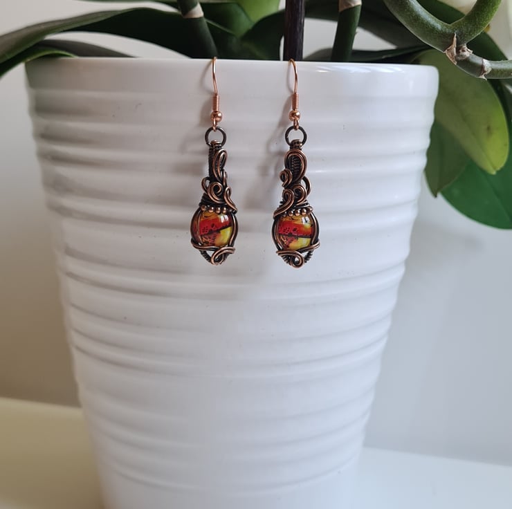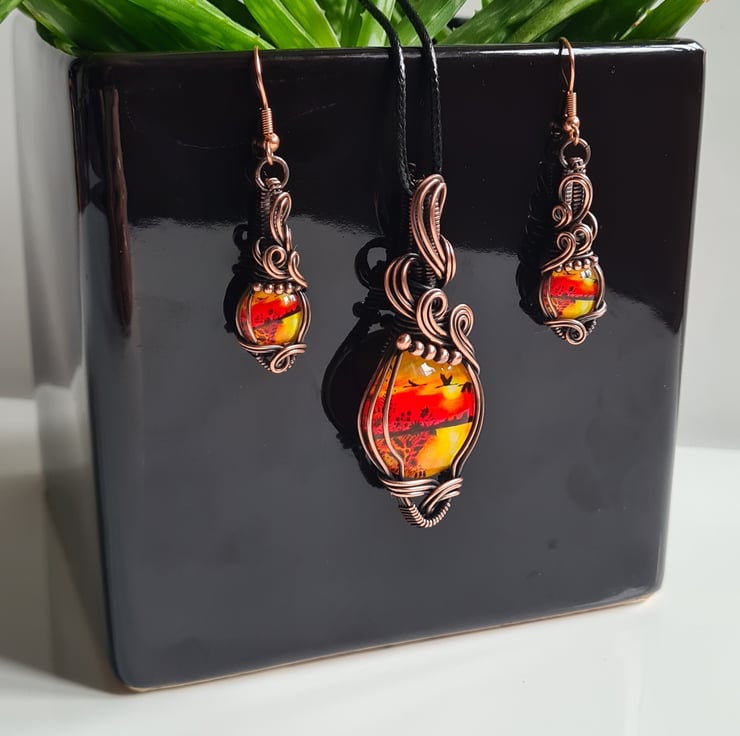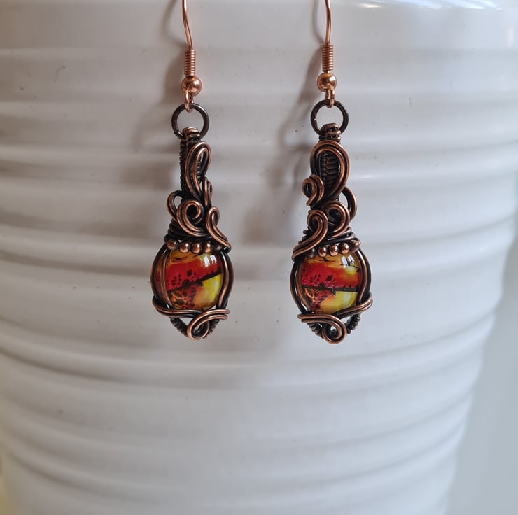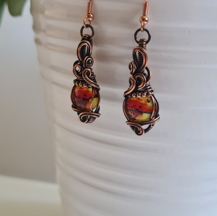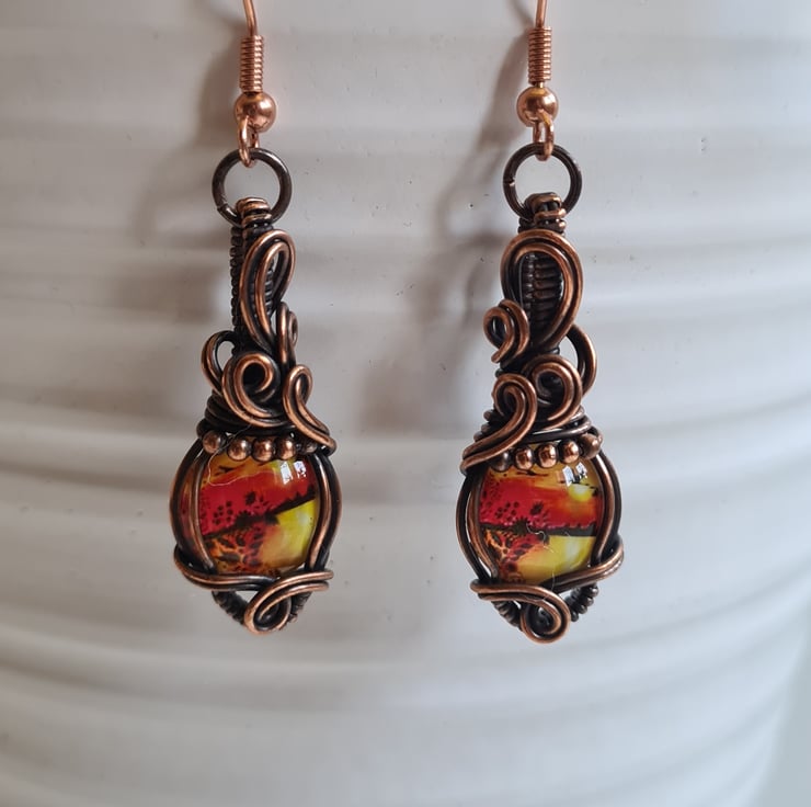 I have handcrafted these beautiful and one of a kind earrings using these stunning glass cabochons featuring a Sunset over water scene with flying birds, which I have wrapped with antiqued copper and they are supplied gift boxed. These lovely earrings are a unique design and I also have a matching pendant for these earrings available so please check out my other listings.