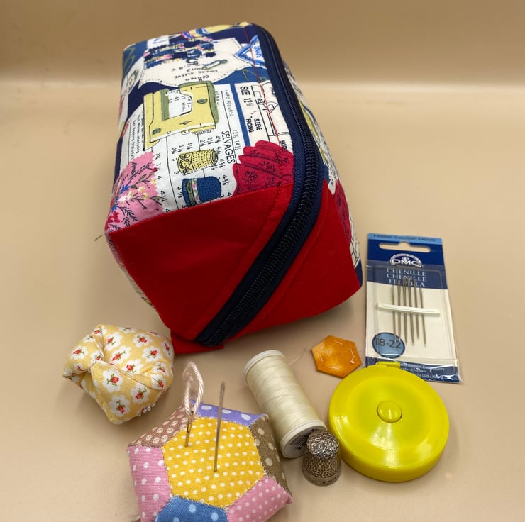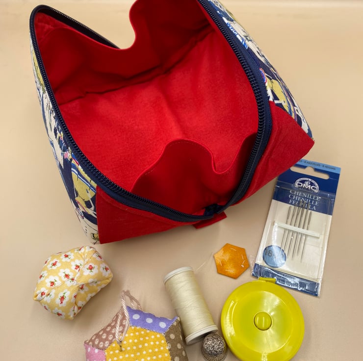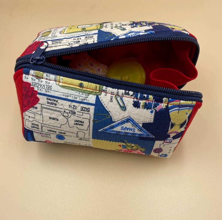 No. 1 has sewing themed fabric with patterns from the fifties etc. a red interior with hand sewn edge binding which means no raw edges, a contrasting navy blue zip which picks up the navy blue in the fabric. This one measures 6 1/2” long, 4” high and 3 1/2” deep, a nice size.
