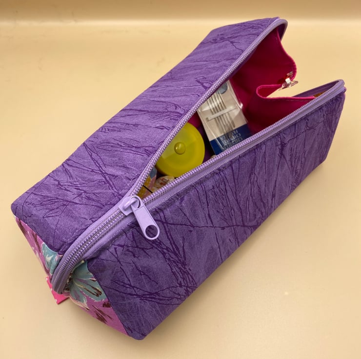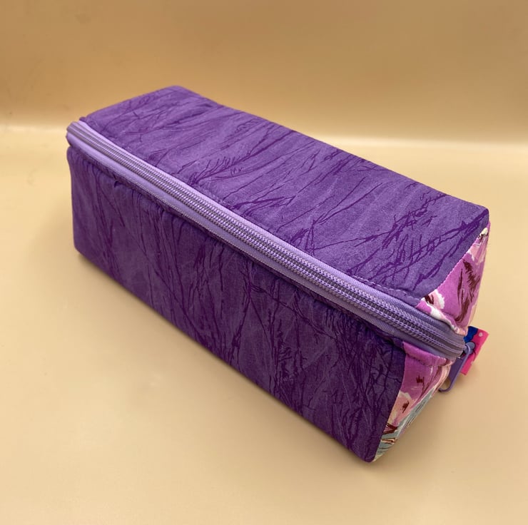 No.2. Is a patchwork of fabrics with the main colours being purple and deep pink with a lilac zip. This one measures a bit longer at 9 1/2”