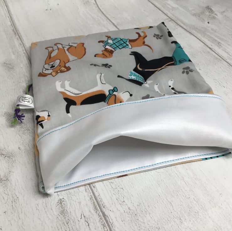 The outside is made from a cotton fabric decorated with a variety of dogs in quirky outfits. The lining is a white food-safe, waterproof fabric known as PUL - more details below. It is great to keep food fresh, can be wiped clean or washed by hand or in the machine. Reduce your use of cling film, foil or single use plastics whilst making your lunch so much more attractive.