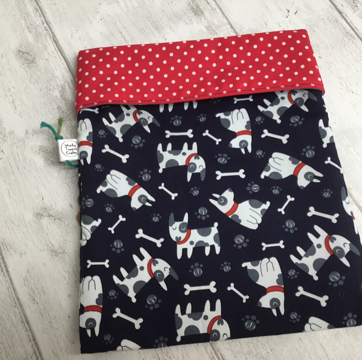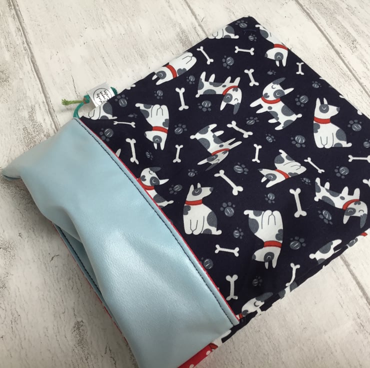 The outside is made from navy cotton fabric decorated with cute cartoon dogs and bones and decorated with a red trim. The lining is a pale blue food-safe, waterproof fabric known as PUL - more details below. It is great to keep food fresh, can be wiped clean or washed by hand or in the machine. Reduce your use of cling film, foil or single use plastics whilst making your lunch so much more attractive.