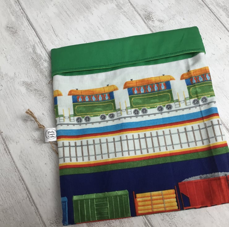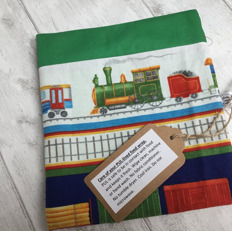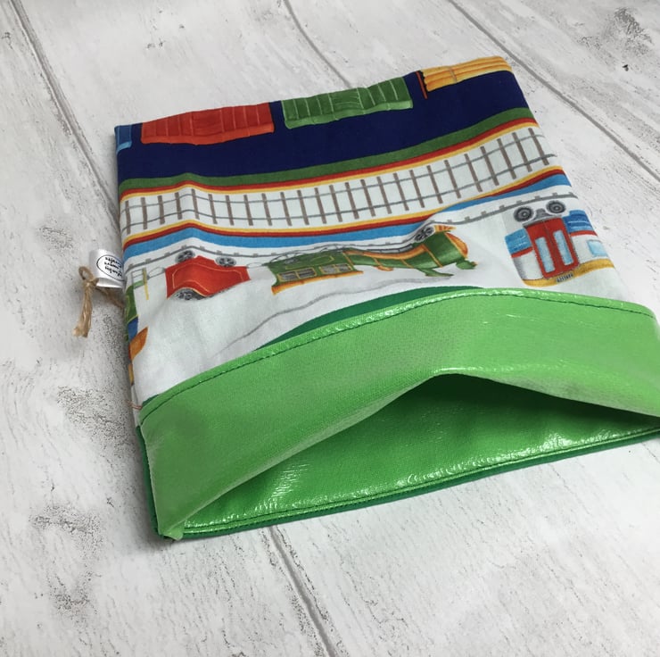 The outside is made from a cotton fabric decorated with brightly coloured trains, trimmed with bright green. The lining is a green food-safe, waterproof fabric known as PUL - more details below. It is great to keep food fresh, can be wiped clean or washed by hand or in the machine. Reduce your use of cling film, foil or single use plastics whilst making your lunch so much more attractive.