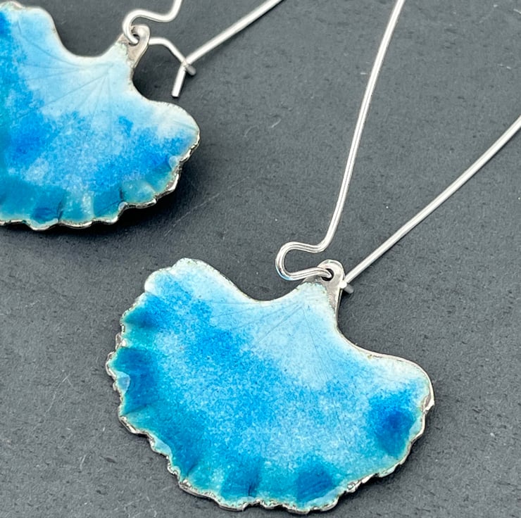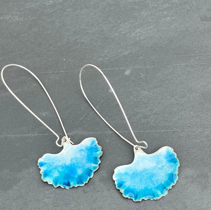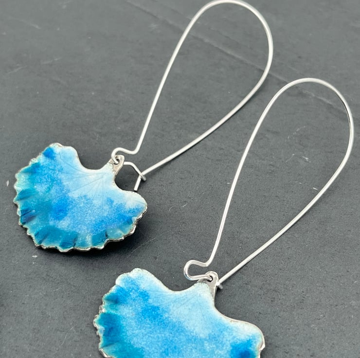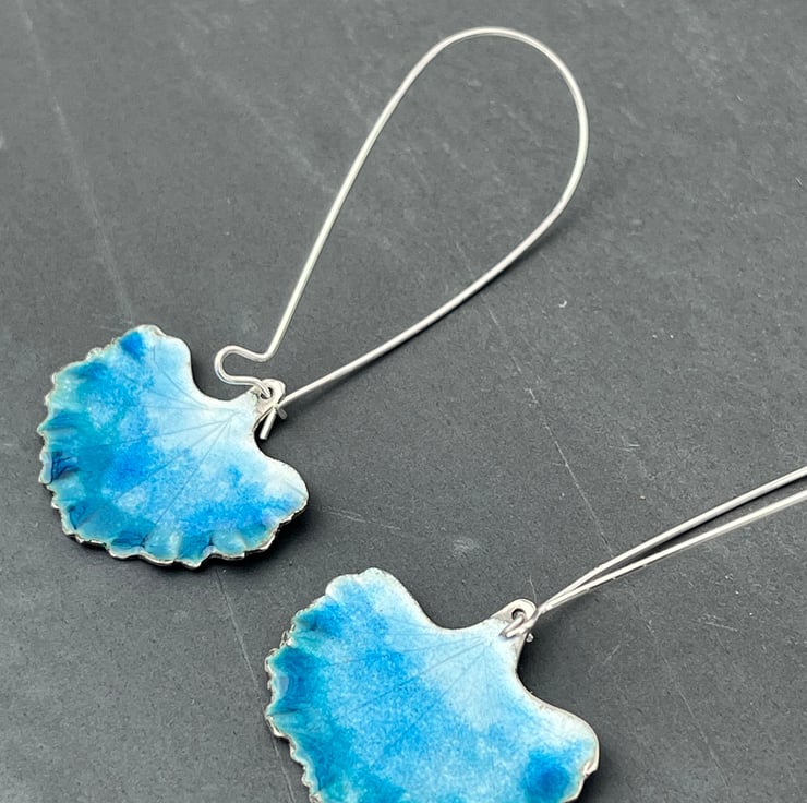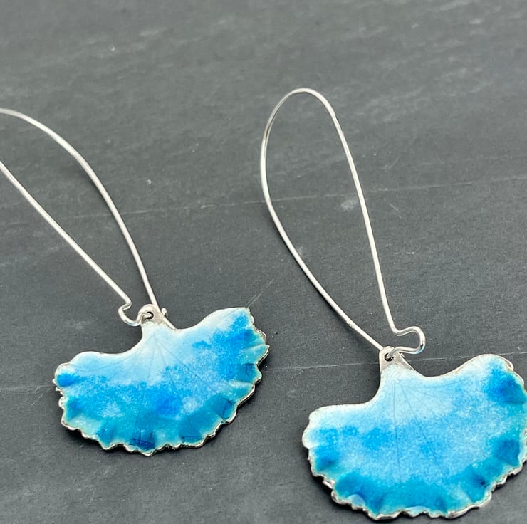 These Gingko Leaf Earrings have been handcrafted by Michelle using Sterling Silver and beautiful blue enamels. They have a width of approximately: 2cms and hang on long Sterling Silver hooks. If you would prefer them on short standard earring hooks please let Michelle know at Checkout.