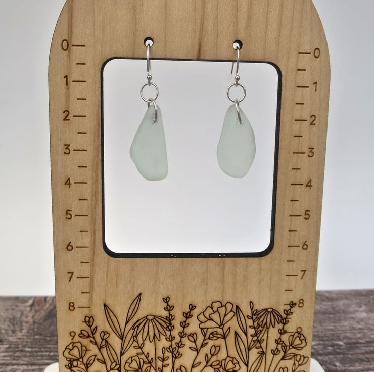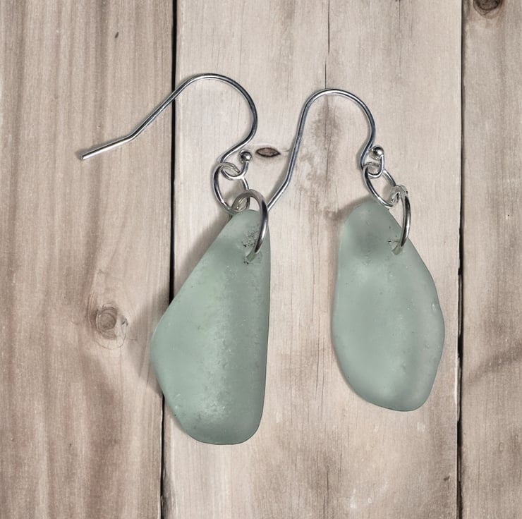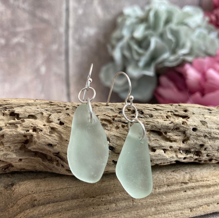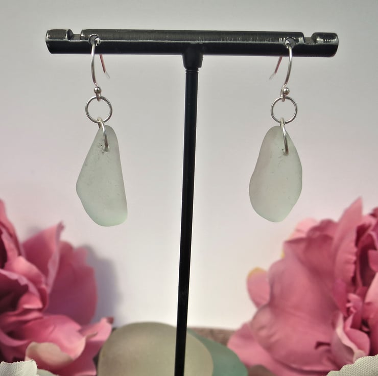 The sea glass hangs from sterling silver ear wires and findings. They measure approx 4cm long.