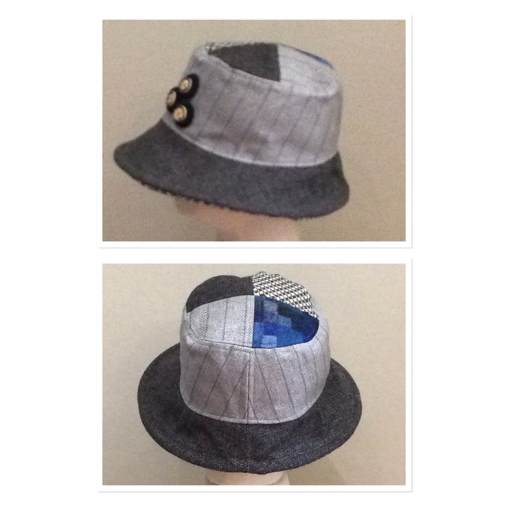 Wool multi piece bucket hat with adjustable brim . Brim can be worn turned up or down . Made to fit head size 22 - 23”. Fully lined
