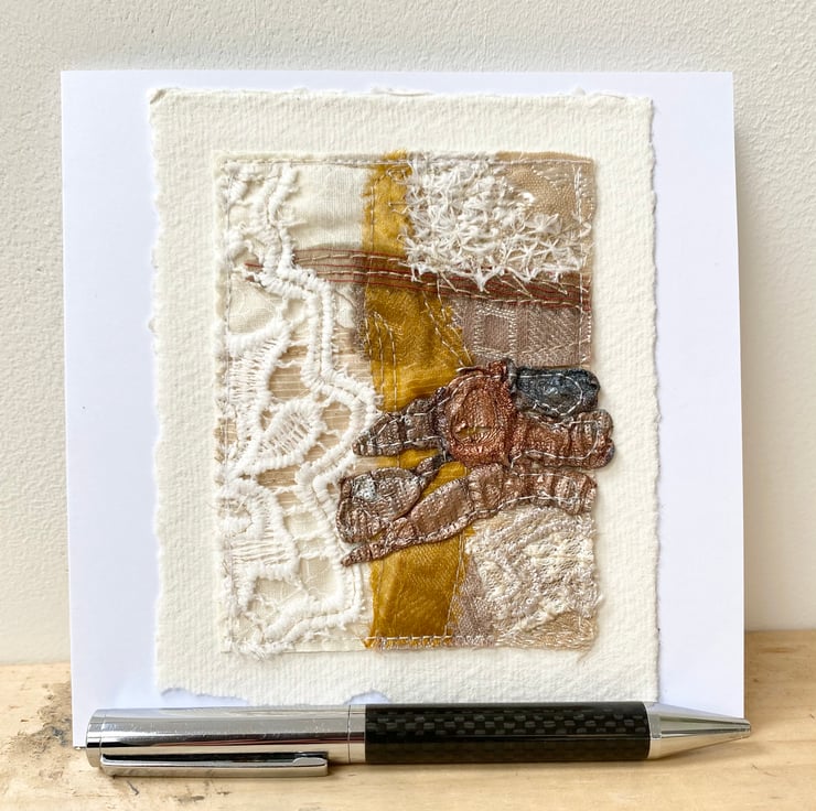 This art card is handmade from up-cycled fabrics and enhanced with free motion embroidery. It contains lace, organza, Tyvek and its mounted on rag paper. This card is for someone very special. It is blank inside making it ideal for any occasion and Birthdays. This white card measures 14.5 x 14.5cm, comes with an envelop and in a plastic cover for protection.