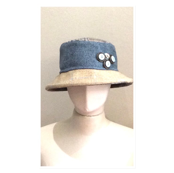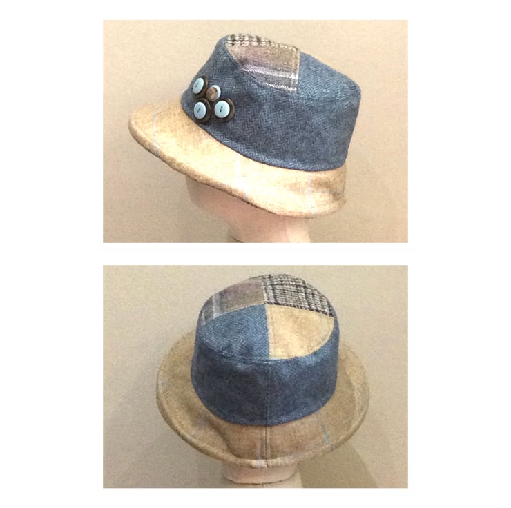 Wool multi piece bucket hat with adjustable brim . Brim can be worn turned up or down . Made to fit head size 22 - 23”. Fully lined