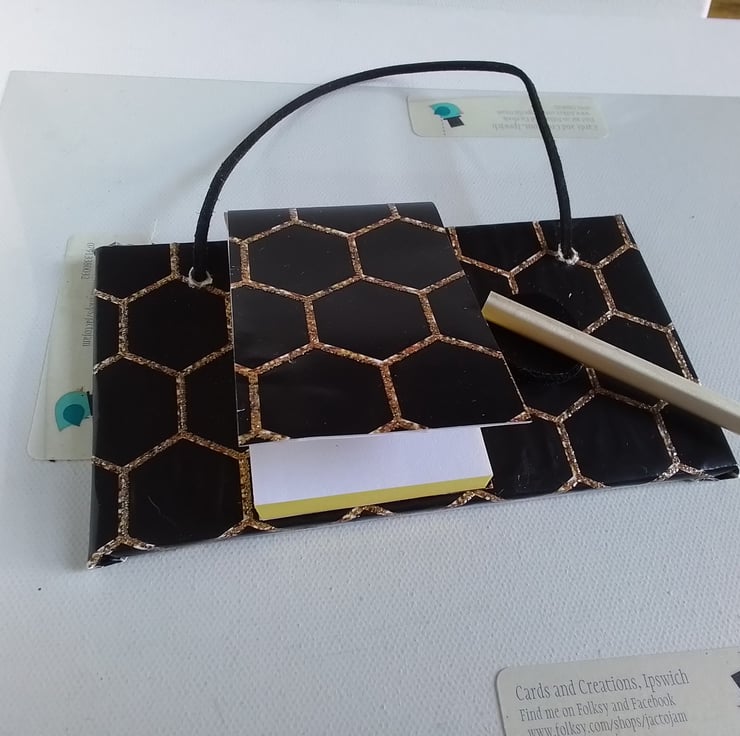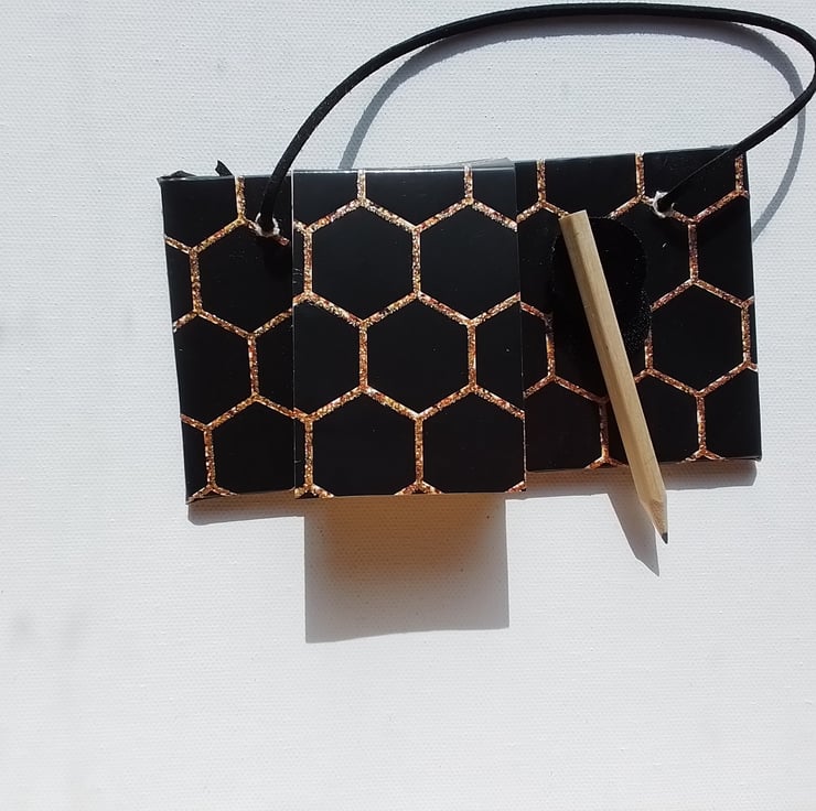 A wooden board has been covered in black and gold honeycomb paper to match the note pad.