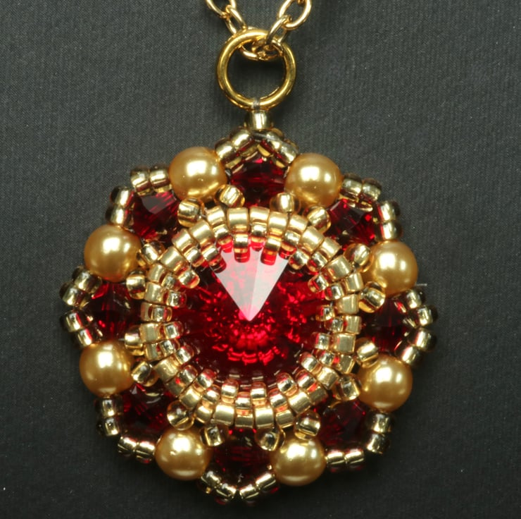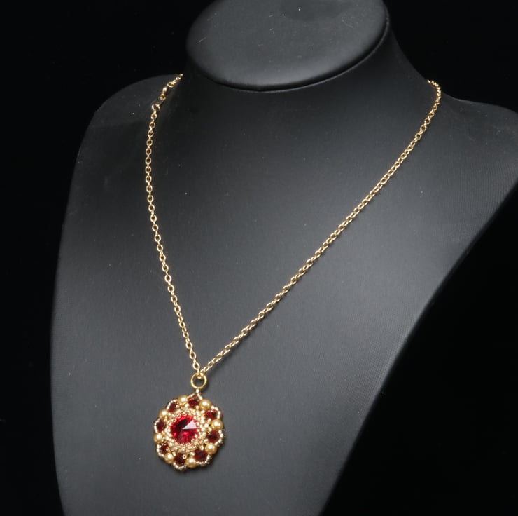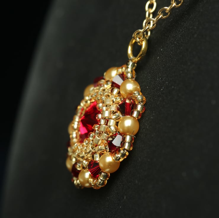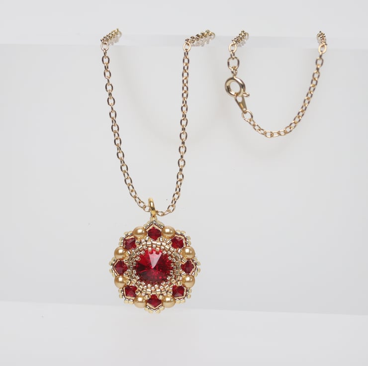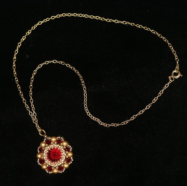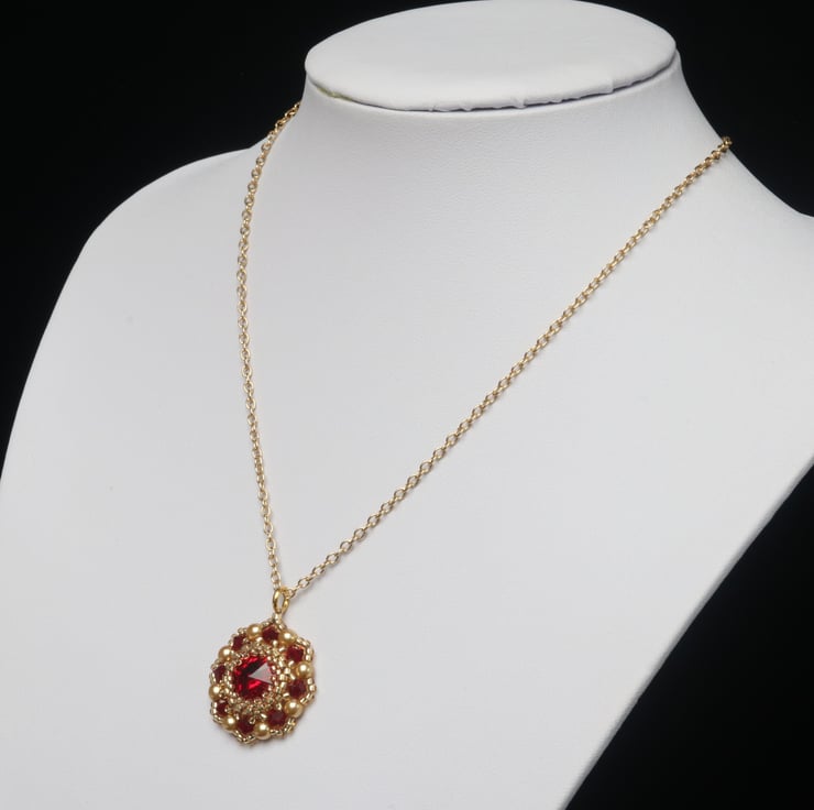 I have used deep red Siam Swarovski crystals and gold seed beads to make this pretty little pendant. It hangs from a gold plated trace chain, which is finished with a matching bolt ring clasp.