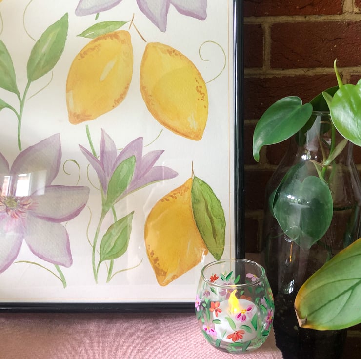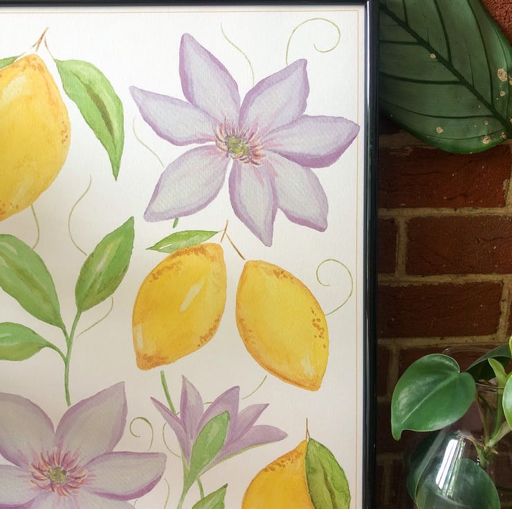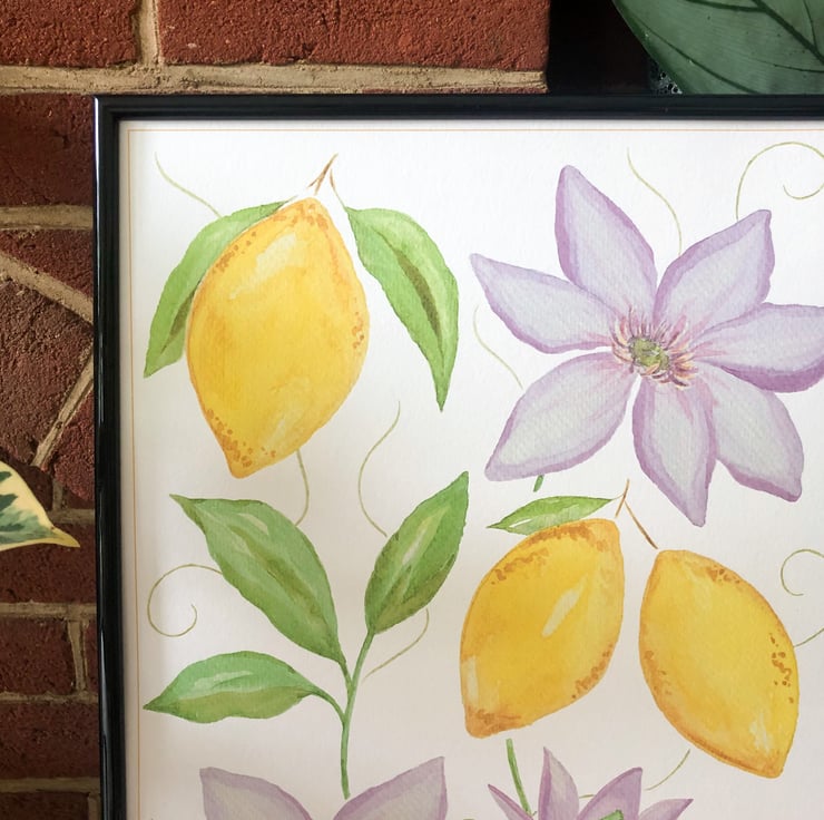 This print was inspired by an original commission for a client who requested a lemon watercolour print. Filled with summer colours, the combination of clematis and lemons creates a print that's perfect for multiple areas of your house - from the kitchen to the hallway!