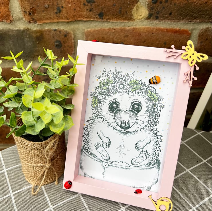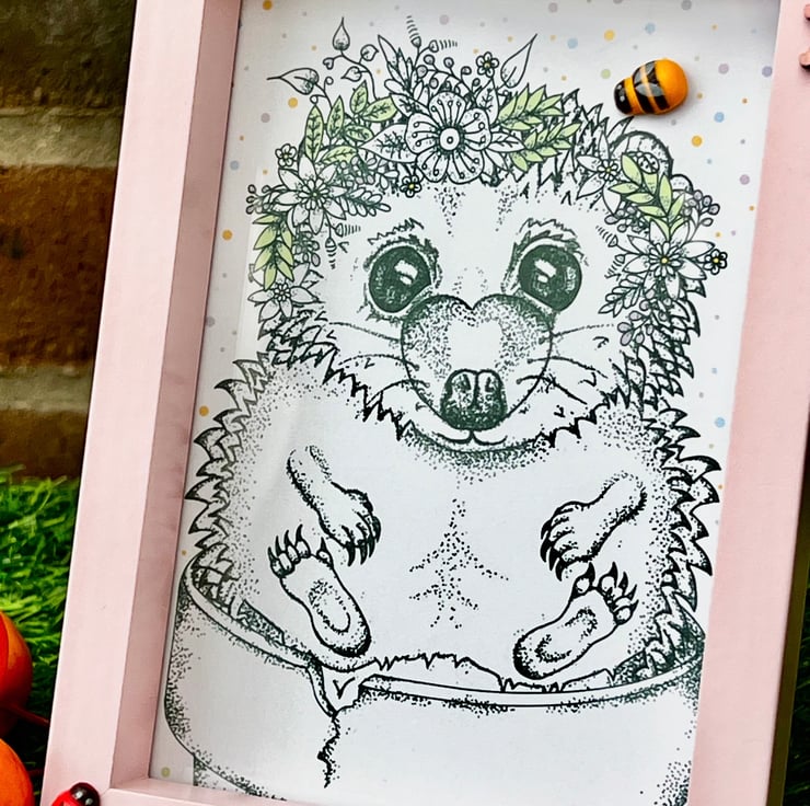 This is a unique and charming decoration and would make a great gift for any hedgehog and gardening fan's young or old. The frame comes with a stand and would look great in the kitchen, garden room or child's bedroom/nursery.