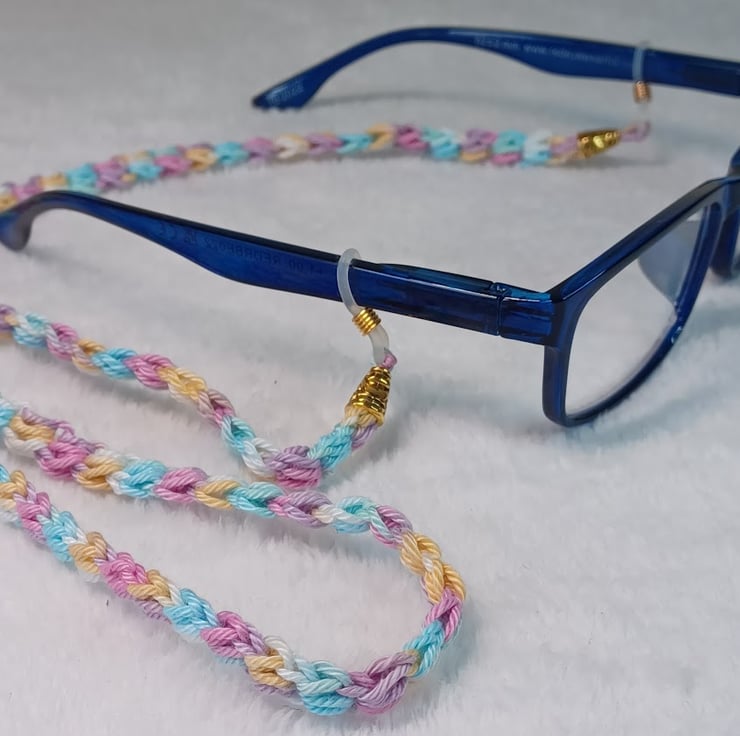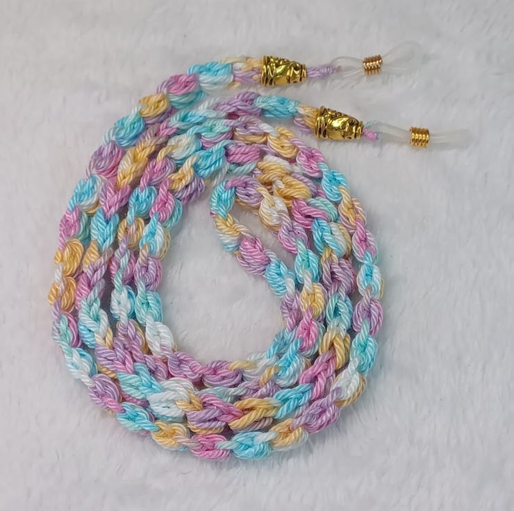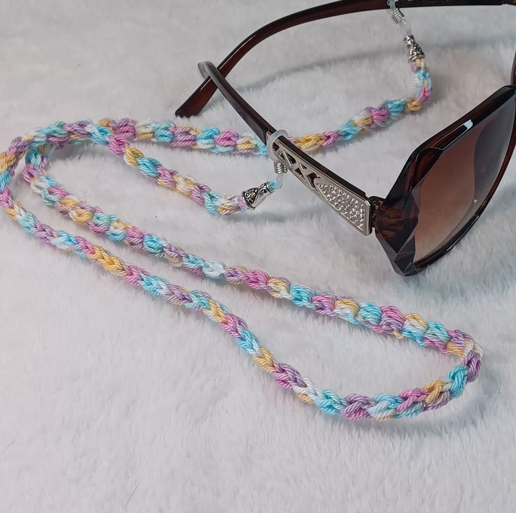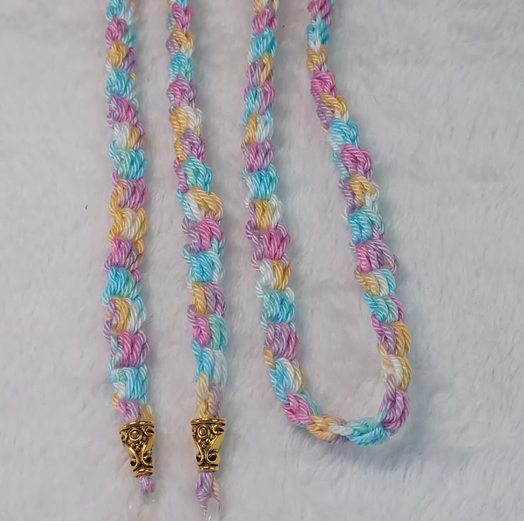 Crochet light multicolours colours (blue, white, pink, purple, yellow) cotton chain for glasses with nice silver or gold colour end bead and white (clear) loop