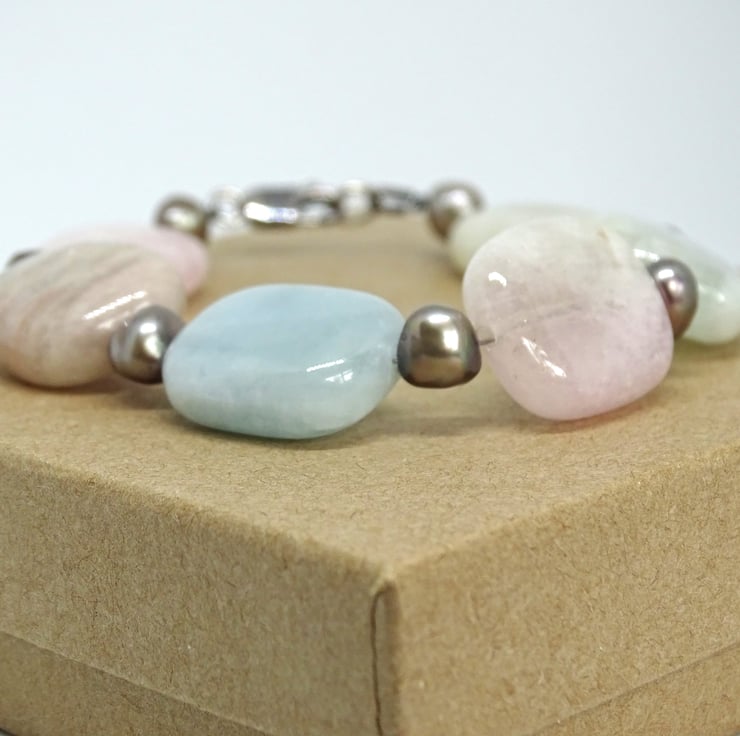 This bracelet is made with puffy Beryl rectangles interspersed with Lavender Pearls and secured with a sterling silver lobster clasp fastening.