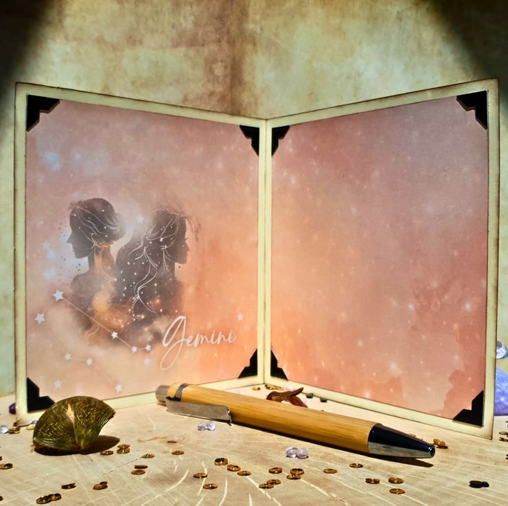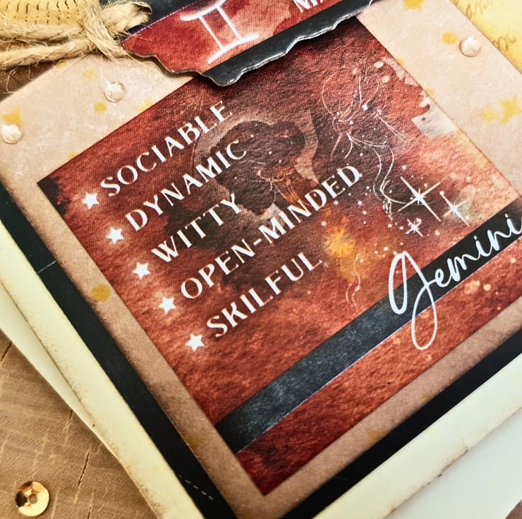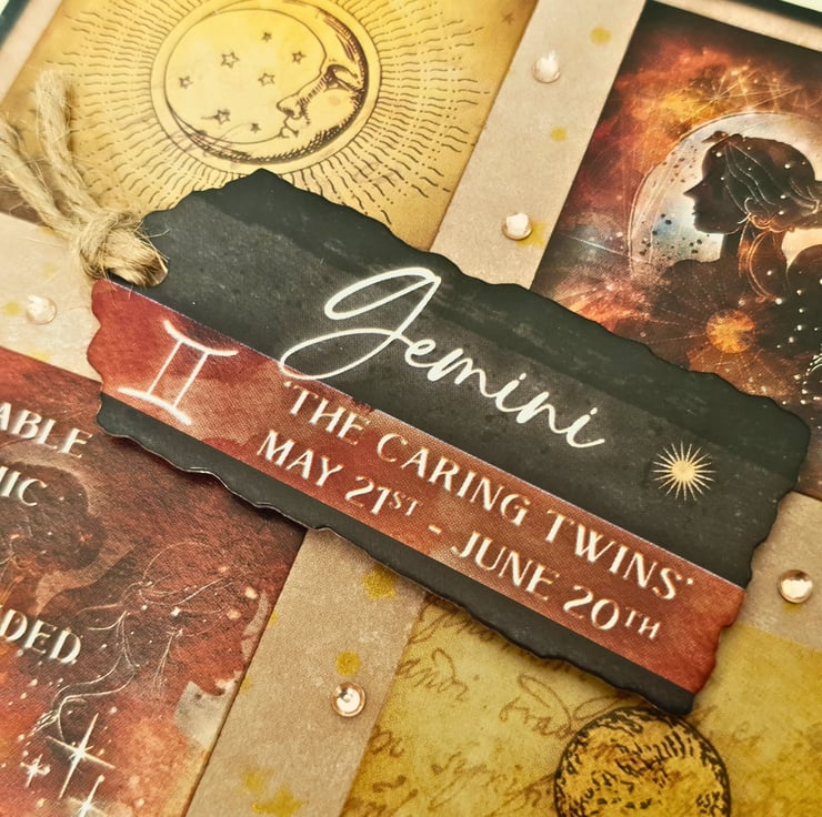The card consists of mats & layers of black card, luxury paper in brown shades & Gemini themed toppers. The decorative tag in the middle reads: "Gemini, The caring Twins, May 21st - June 20th" & is embellished with natural twine. Underneath the tag, there are 4 square panels, with info for the Gemini zodiac sign, such us the planet, and key personality characteristics. The card is decorated with diamante gemstones & it is finished with a double coordinating insert that has been left blank, for you to add your own messages and wishes. It measures approx.13.5cm square and it is with ivory card base. All the edges have been inked with brown, to give a vintage look. It comes with an envelope to match the size & the colour of the card & is kept in a clear cellophane bag for protection. A small sticker with my shop details has been added at the back of the card.