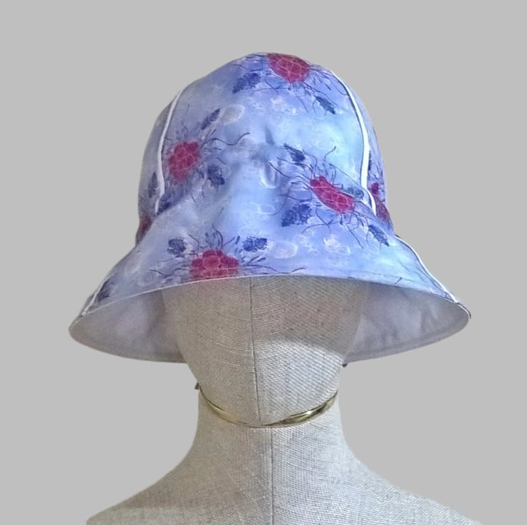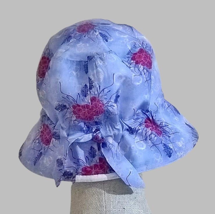 The fabric has a beautiful raspberry and lavender floral design on a blue background. Piping in white hemp trims the front, adding a subtle chic touch, and the brushed cotton lining provides both comfort and form to the colourful light cotton/ silk fabric.