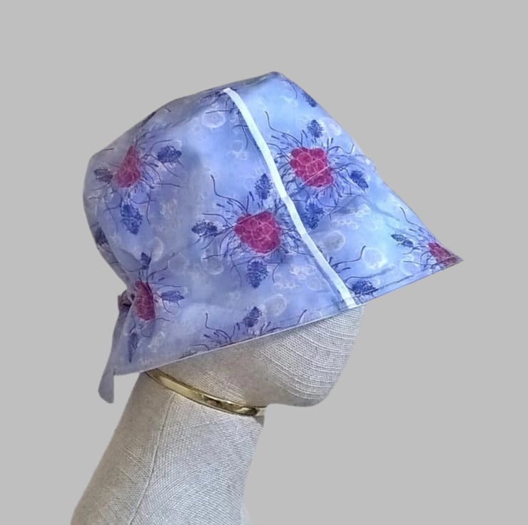 Lightweight and breathable summer bucket style hat with adjustable tie detail at the back, handmade in cotton silk blend, trimmed with hemp and lined with cotton.