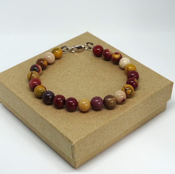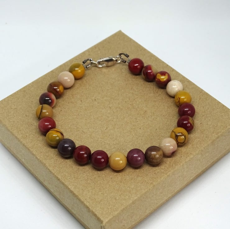 This bracelet is made with round Mookite beads and is secured with a sterling silver lobster clasp fastening.