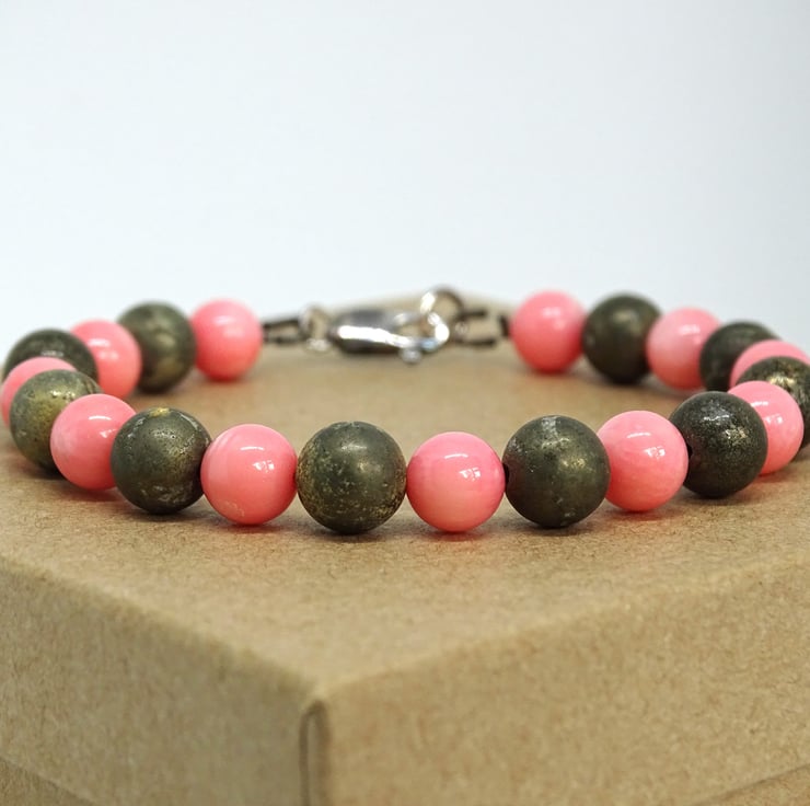 This bracelet is made with Coral beads interspersed with Pyrite beads and is secured with a sterling silver lobster clasp fastening.