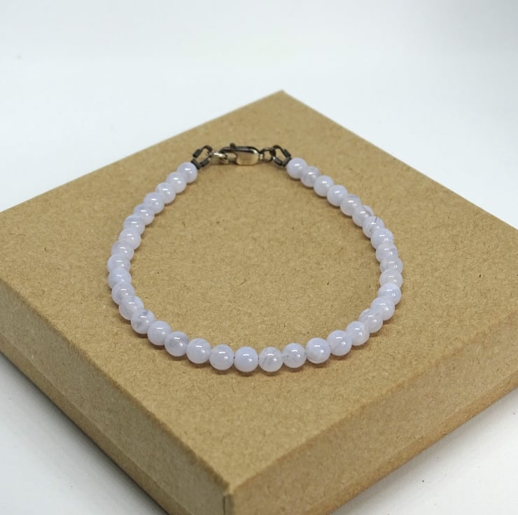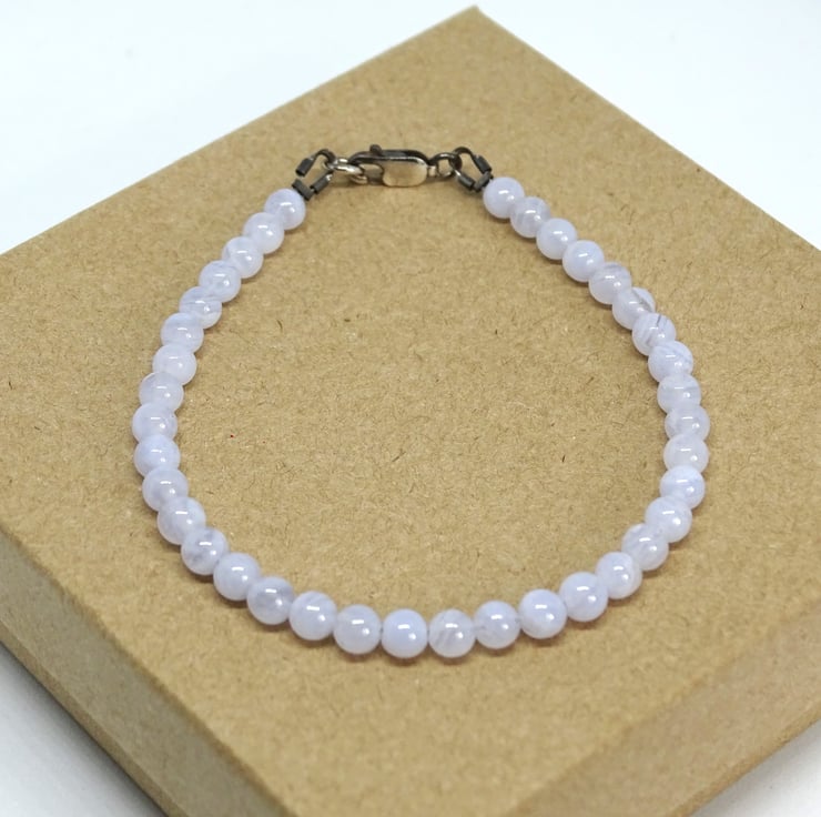 This bracelet is made from small Blue Lace Agate beads and is secured with a sterling silver lobster clasp fastening.
