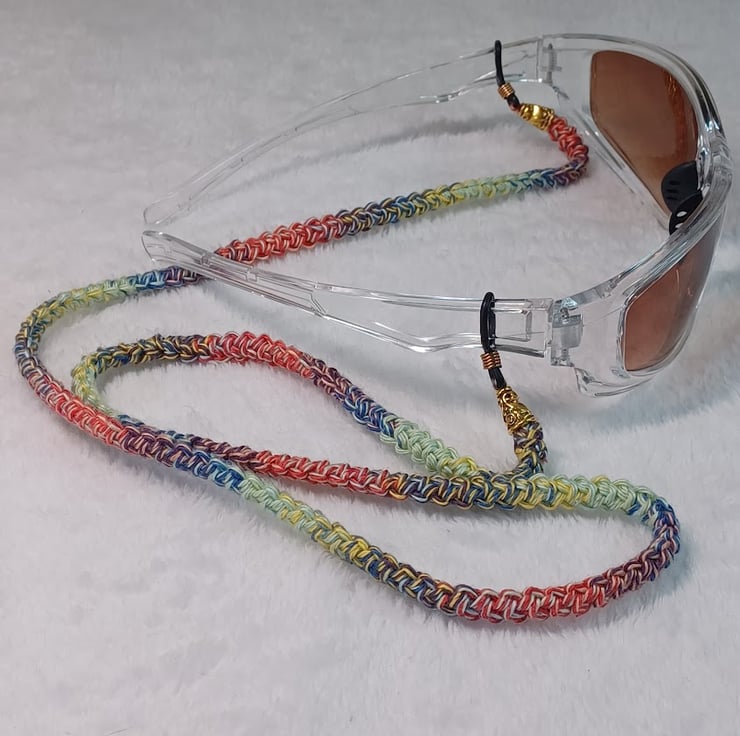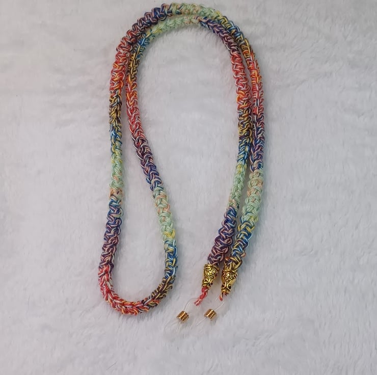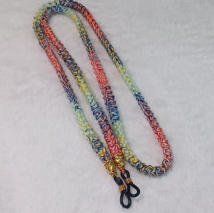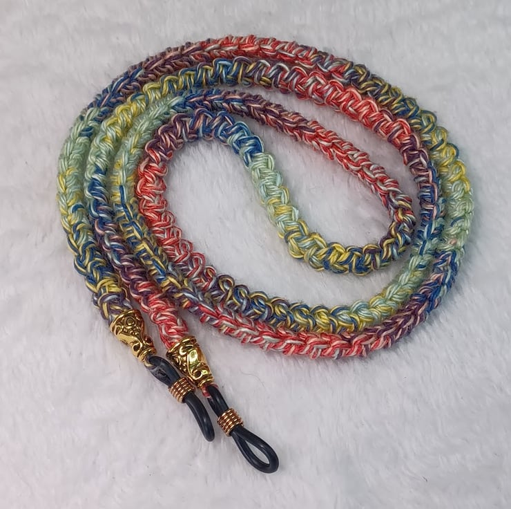 Crochet multicolours colours (red, blue, yellow, light green) cotton cord for glasses with nice gold or silver colour end bead and black or white (clear) loop