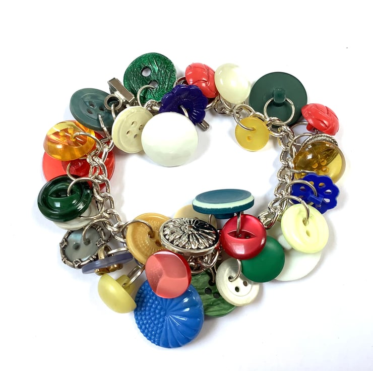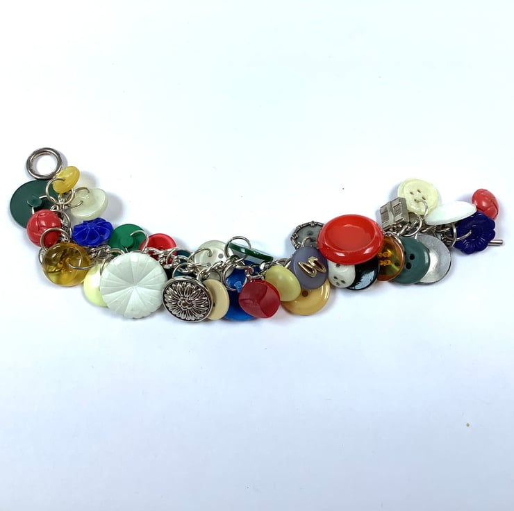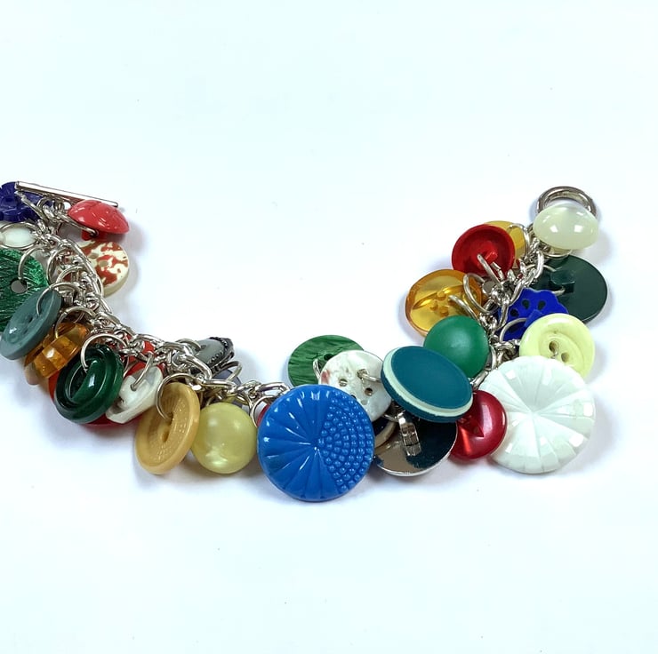 Vintage and re-used buttons have been attached to a chunky chain to make this colourful bracelet.