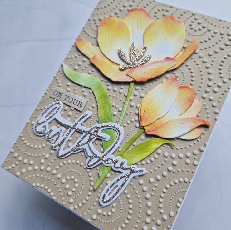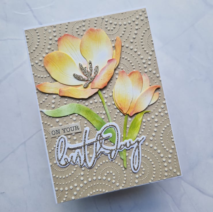 A beautiful textured handmade card featuring two stunning peachy orange tulips against a dotty 3D embossed kraft background. Made from high quality materials, this card is sturdy and makes a great keepsake!