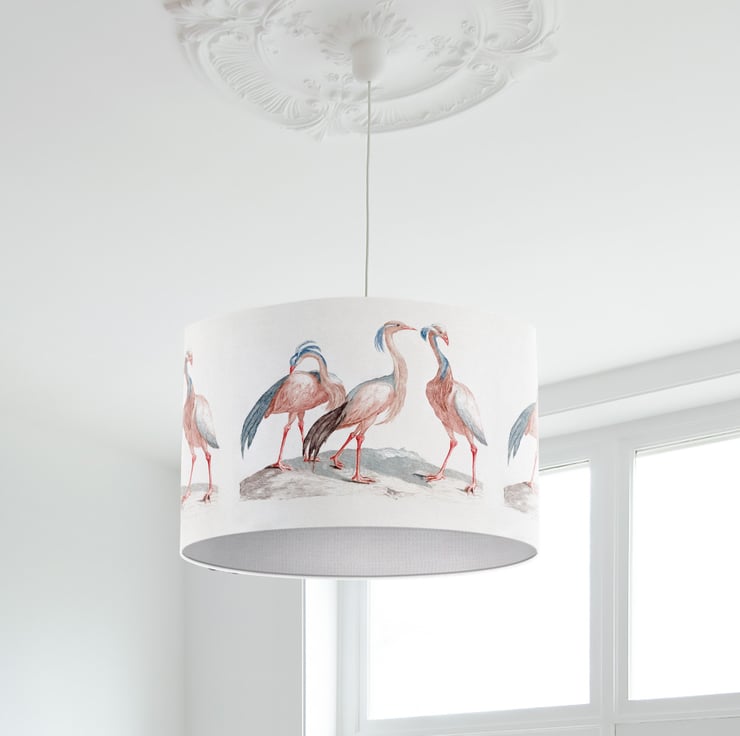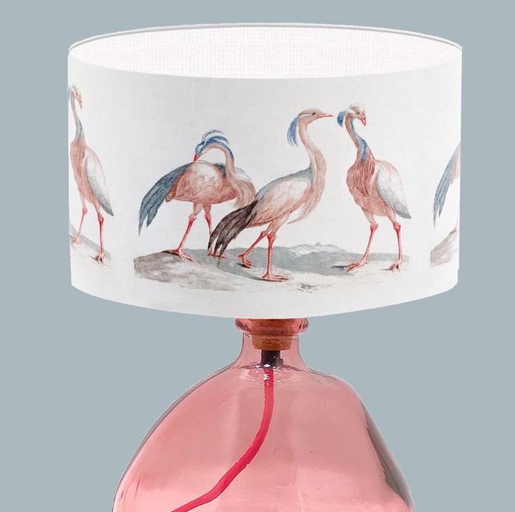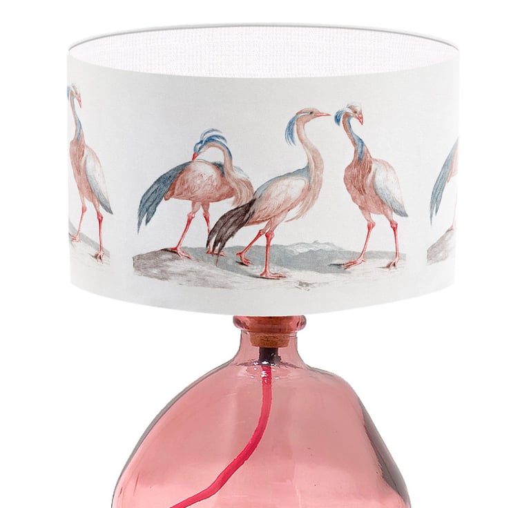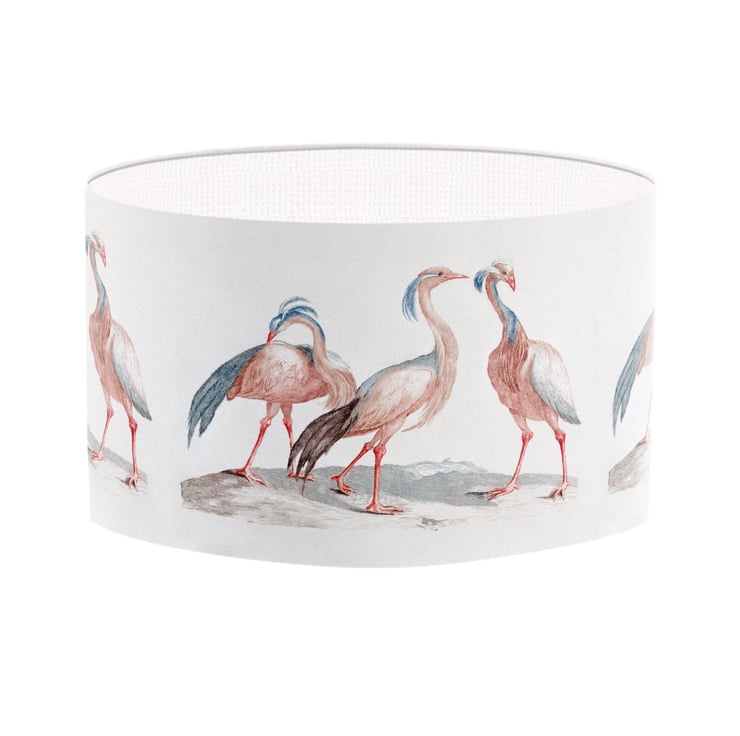 Lampshades don't have to plain and boring. Light up your room in style, color and design. This lampshade is printed with a pastel flamingo print.